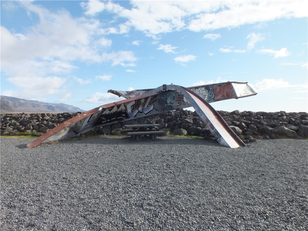 På vägen tillbaks längs ettan som vi åkte igår stannade vi till vid vad vi trodde var nåt märkligt konstverk. Det skulle visa sig helt fel. Det var i själva verket en del av en bro som slets sönder av is och vatten som plötsligt släpptes iväg av en glaciär ovanför. Man inser vilka krafter det handlar om när man betraktar den gamla balken. För att böja till den på detta vis krävs det lite styrka.