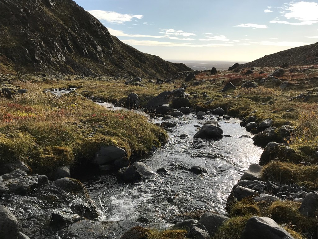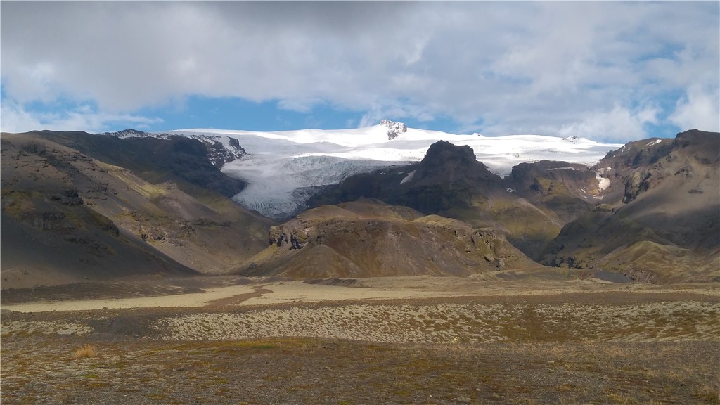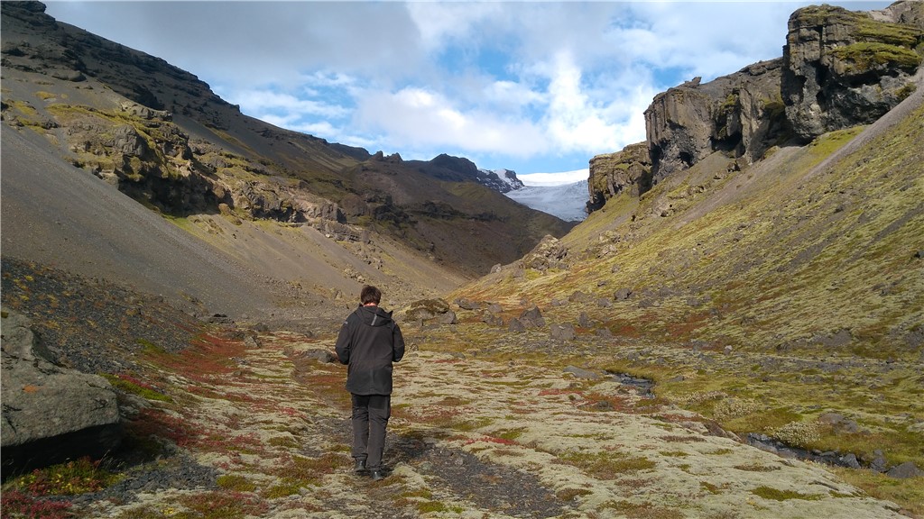 När vi kom fram till bergkammen övergick såret i en smal stig och naturljud var allt som återstod. Lite lätt bris och en lätt forsande större bäck med smältvatten från glaciären. Vi gick en stund vidare i bergspasset mot glaciären innan vi vände tillbaks mot bilen. Vi kände oss då väldigt privilegierade. Ödsligheten och ensamheten är verkligen påtaglig och om man betänker att i den här delen av Island bor det enbart 2 människor per kvadratkilometer så förstår man var känslan kommer ifrån.