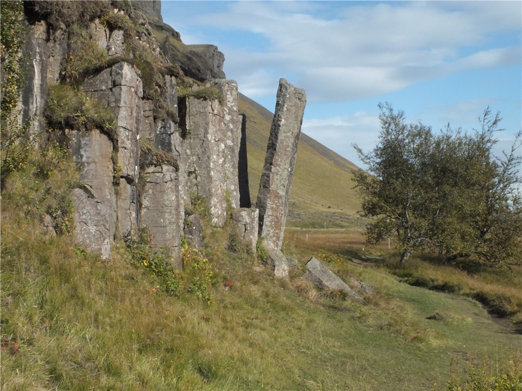 Ett kort stycke därifrån ligger Dverghamrar. Det är ett naturfenomen skapat på samma sätt som Kirkjugólf men här kan man se pelarna av basalt som var helt övertäckta på den första platsen. Dessa var dessutom större, diametern var uppåt metern här. Det såg verkligen underligt ut när vi stirrade på bergväggar av sexkantiga, tjocka stenpelare.