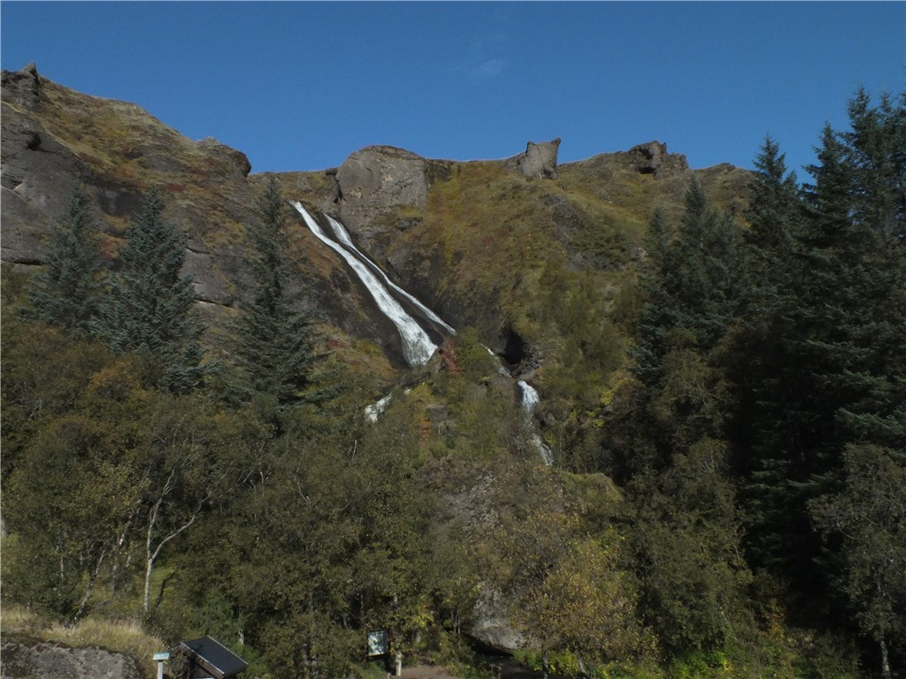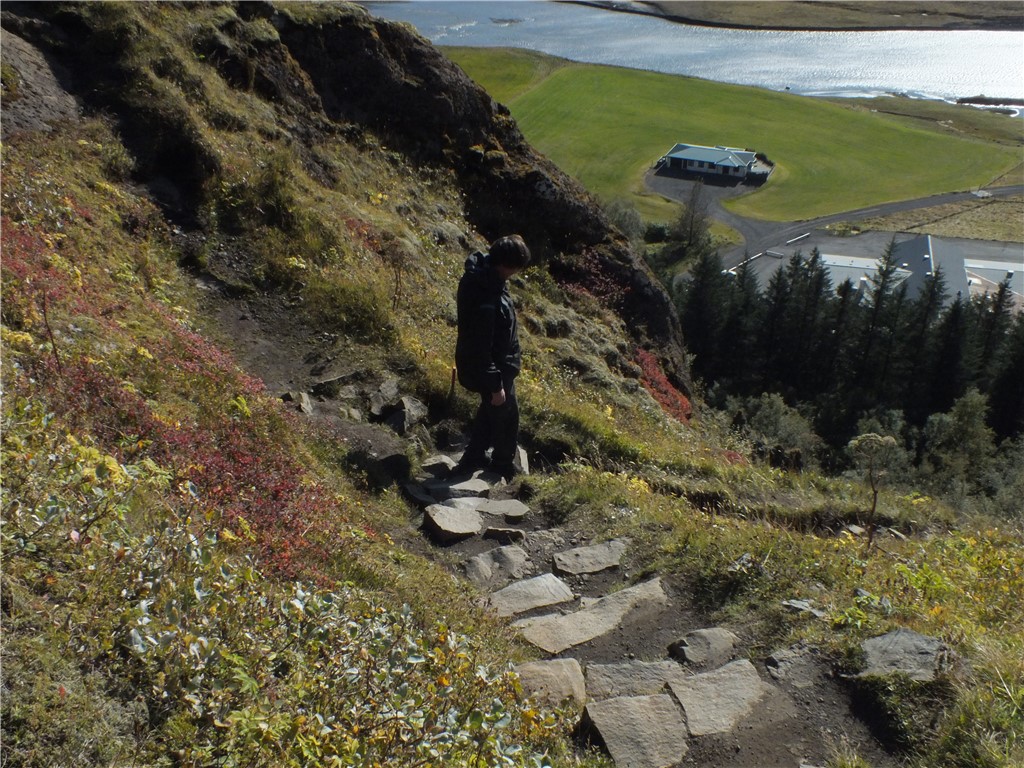 Att påstå att vi skuttade upp som bergsgetter är väl att överdriva men upp kom vi och utsikt var det. Ovanför fallet fanns det en sjö som heter Systravatn. Sägnerna säger att traktens nunnor ofta badade här och en gång när två systrar badade såg de en hand hållande en guldkam i vattnet. De jagade efter den och sjönk ner under vattnet för att aldrig återses igen.