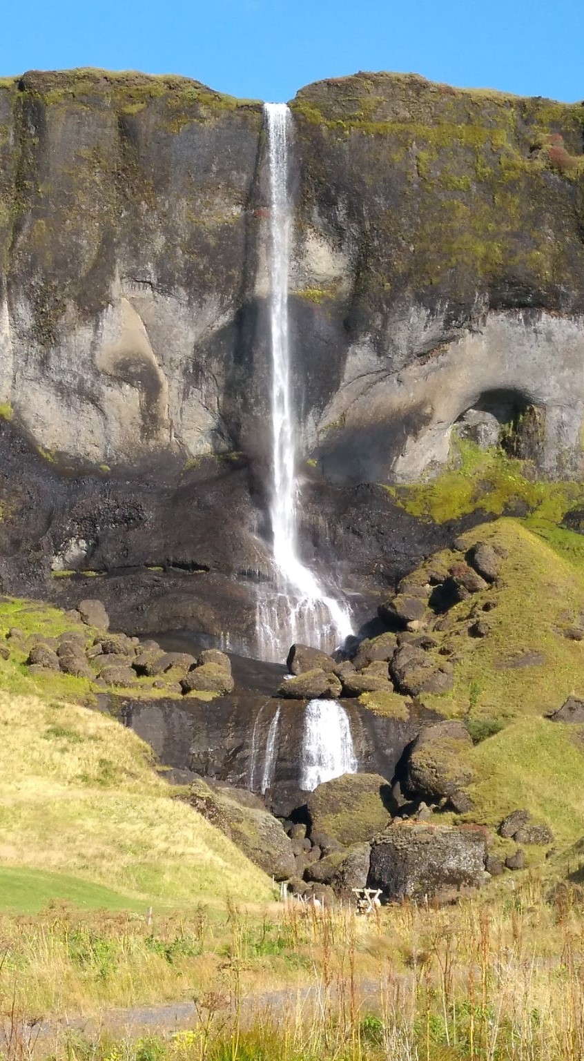 I Kirkjubæjarklaustur fanns även en geocache. Det skulle visa sig (som så ofta) att den sammanföll med en plats som var beskriven i våra guideböcker. Vi styrde mot den och hamnade nedanför ett rätt spektakulärt vattenfall, Systrafoss. Det föll ner för ett tämligen brant berg och uppe på toppen utlovades fin utsikt över trakten. Vi bestämde oss för att ta stigen upp och kolla om det stämde.