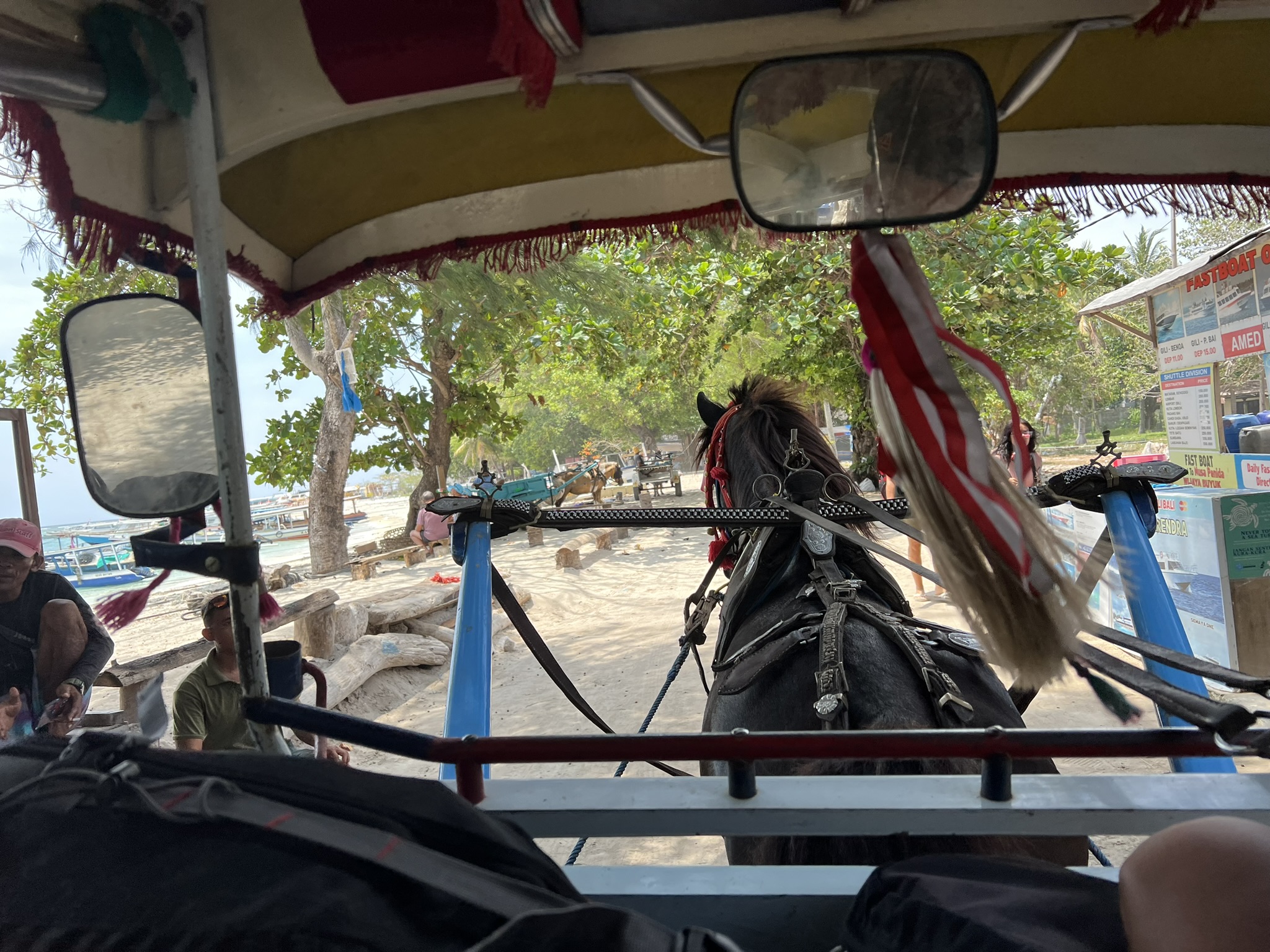 Innan vi klev om bord fick vi betala nån sorts hamnavgift på 10 000 IDR och det skulle vi visst göra även när vi kom i land. När allt sånt var avklarat så stod kom föraren till en hästtaxi och frågade om vi skulle ha skjuts. Vi velade en stund eftersom vi tänk att vi skulle gå men det var enormt varmt så vi tog hästtaxin. Kan säga att det var ett bra val! Kärran efter den lilla starka hästen studsade fram i sanden. Vi insåg att det skulle ha varit en bra bit att gå och tyckte åter att det vi gjort ett bra val som tog hästtaxin.