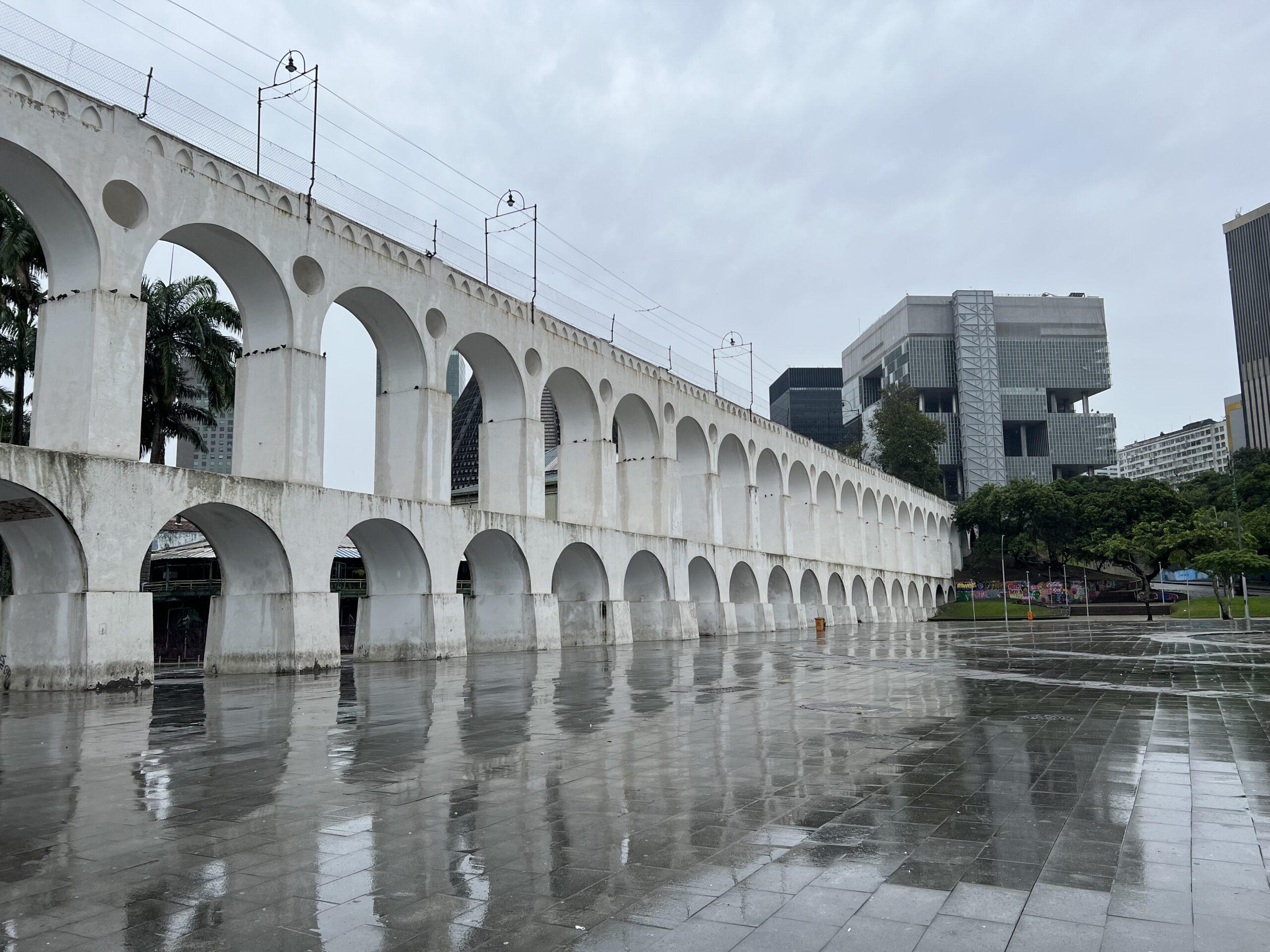 Det småregnade lite fortfarande men luften var klarare när vi nu satte kurs upp mot Kristusstatyn. Först gjorde vi dock ett snabbstopp vid Carioca Aqueduct. En akvedukt som numer är ombyggd till en spårväg för tågen upp mot Santa Teresa.