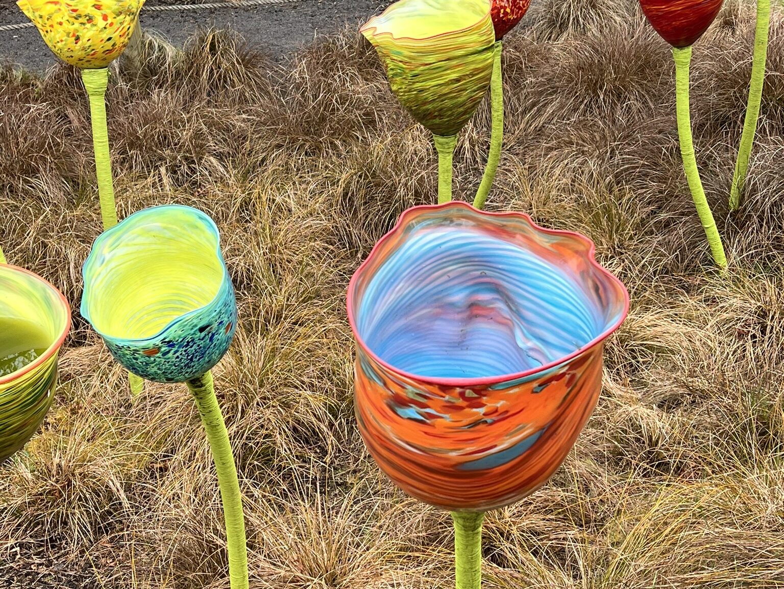 Vi gick länge och tittade på allt de ställt ut. Det började regna men vi lånade paraplyer och fortsatte kika runt. Det enda som nog var lite synd var väl att vi tror det varit ännu vackrare med sol som belyst glaset.