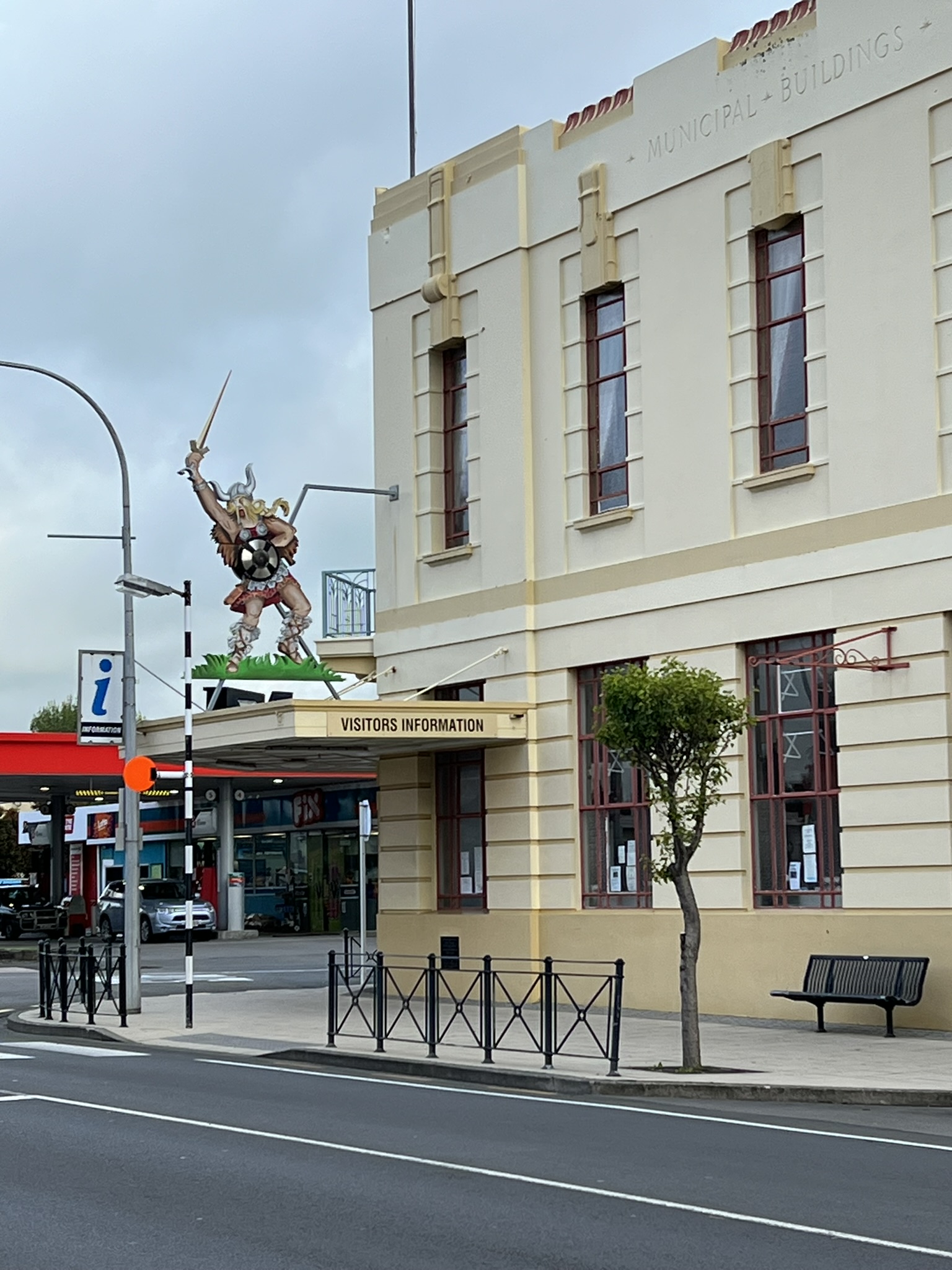 Centrum låg någon dryg kilometer bort och vi såg fler tecken på att det fanns nån anledning till det nordiskt klingande namnet. Vi passerade Viking Lodge, på stadshuset stod en viking och gatukorsningarna var prydda med vikingasköldar. En snabb googling på Dannevirke gav vid handen att det var många skandinaver som först kom hit (långt efter Maorifolket såklart) och då grundade staden. Enligt Wikipedia har staden drygt 5 000 invånare och vi fascinerades över hur mycket av affärer och service som fanns här jämfört med hemma. Massor med affärer at olika slag, flera banker, poliser och till och med en domstol. Vaxholm där vi bor har betydlig större befolkning men saknar det mesta av detta.
