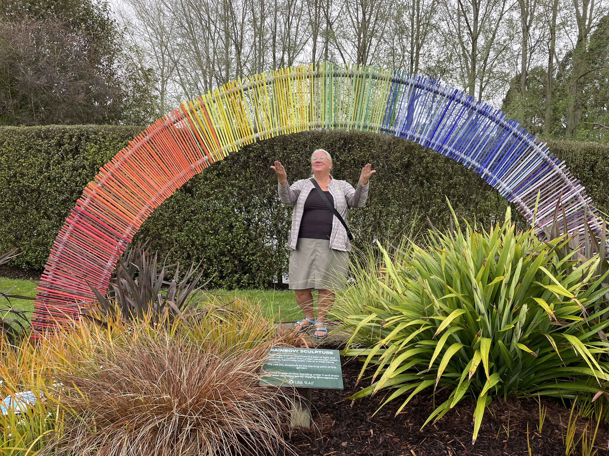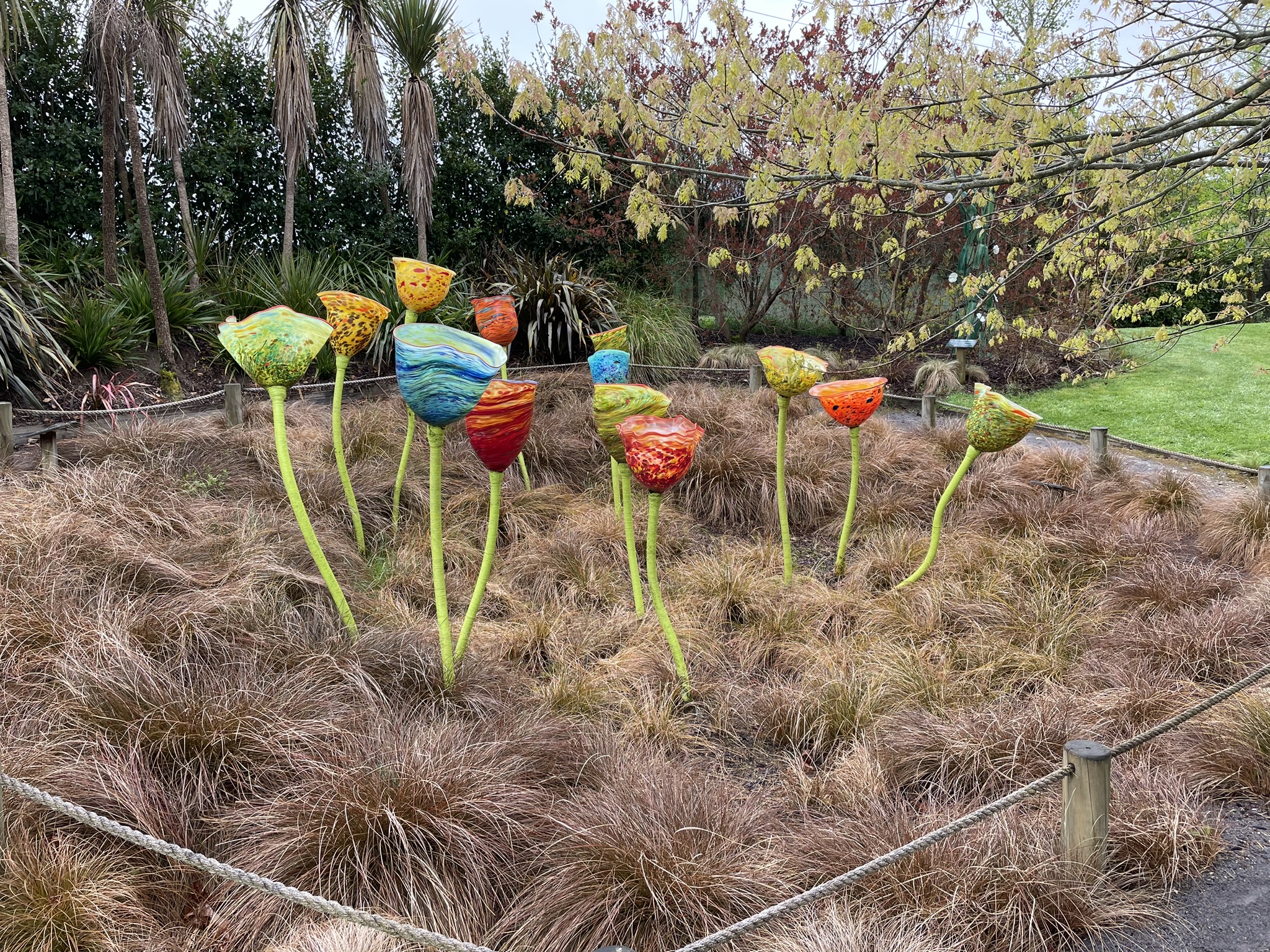 Efter frukosten var vi redo att bege oss av. Maria hade hittat reklam för en trädgård fylld med glaskonst som låg straxt utanför Taupo som lät som ett spännande stopp. Vi började med att tanka dock. Det är otroligt vad bilen har dragit i blåsten. Minst en och en halv liter milen uppskattar jag det till. Hoppas det blir bättre när det slutar blåsa.