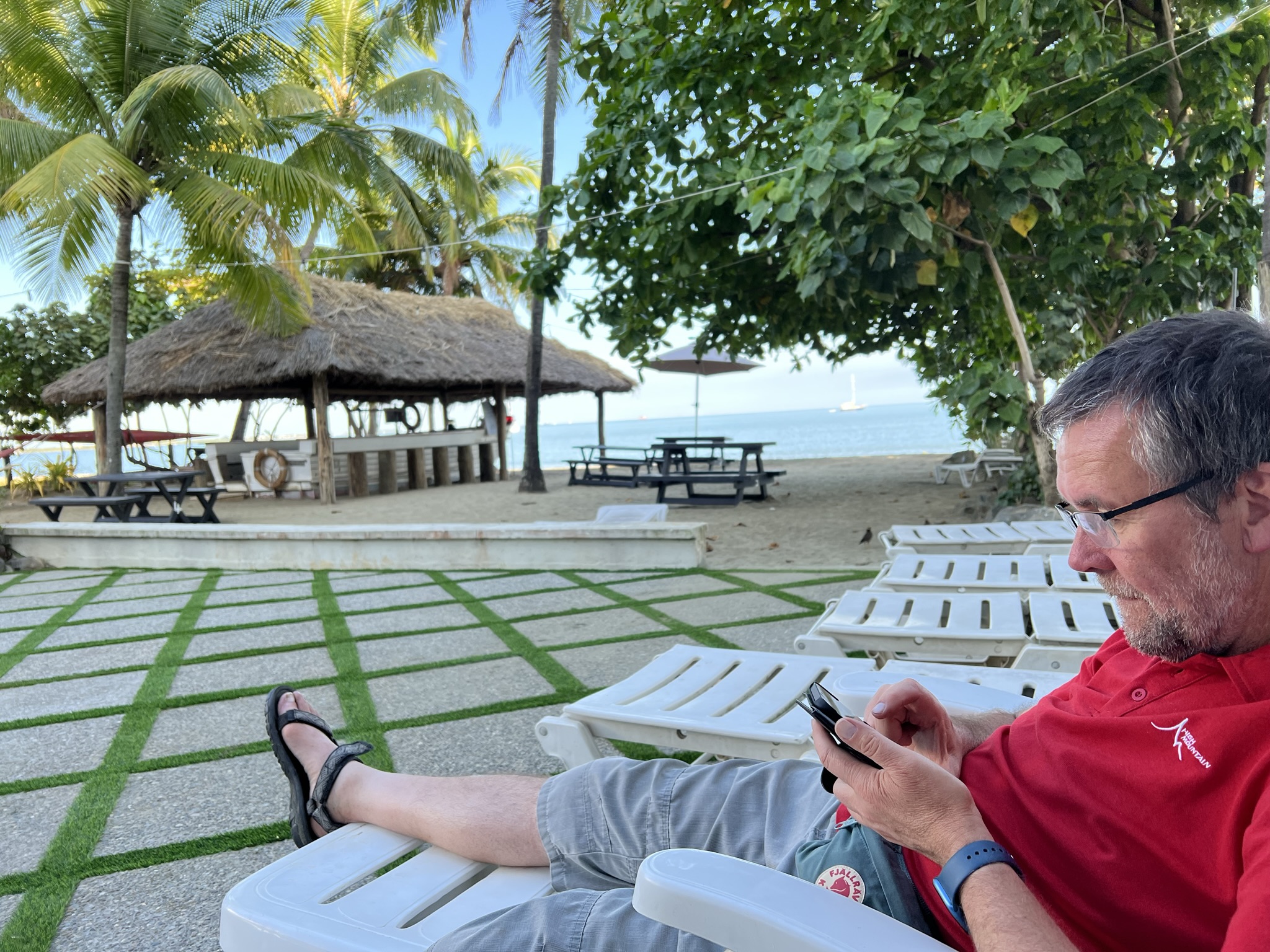 Rummet var såklart inte klart vid den tiden så vi bytte om och slog oss ner i varsin solstol. Spanade in området men ”vilade” mest (Maria påstod att jag snarkade vilket jag förnekar) i väntan på vårt rum.