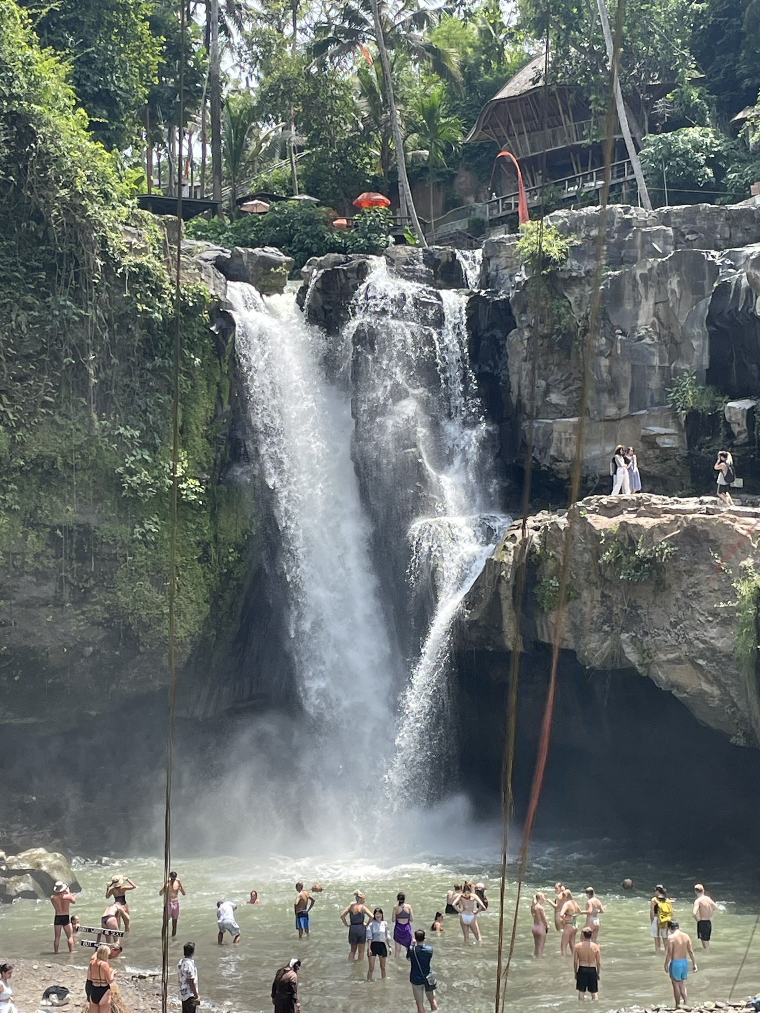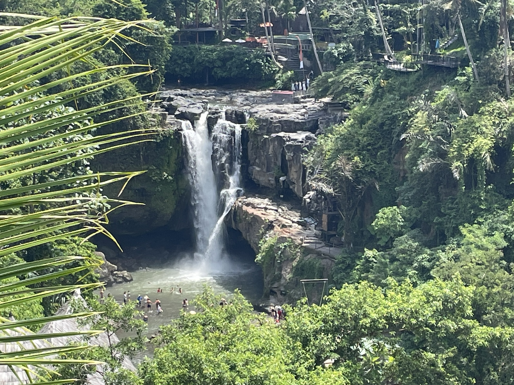 Vår guide väntade utanför själva teatern och tog oss sedan vidare till ett vattenfall i Tegenungan Village. Det var ett litet fint vattenfall med en hel turistindustri uppbyggd runtomkring. Det fanns både barer och restauranger i mängder. De hade byggt upp olika platser som exempelvis fågelbon där man kunde sitta och bli fotograferad med vattenfallet bakom. Mycket var ju gjort i metall och bara trappräckena var så varma att man knappt kunde ta i dem. Jag kan bara tänka på hur varmt det var för dem som försökte sätta sig och bli fotograferade i dessa fågelbon!