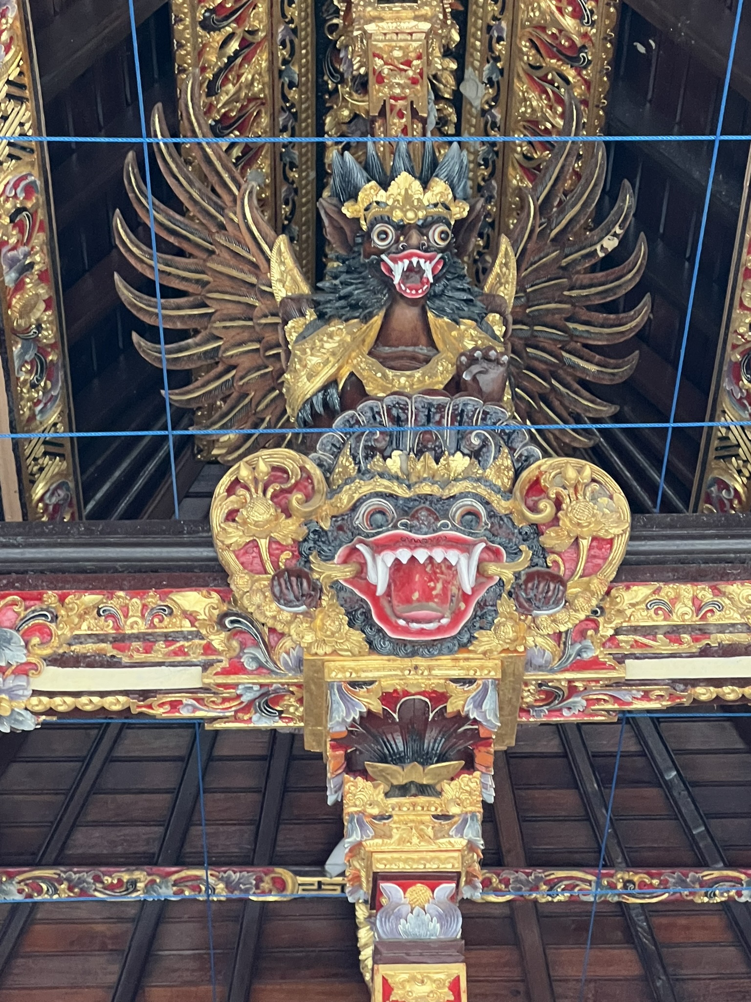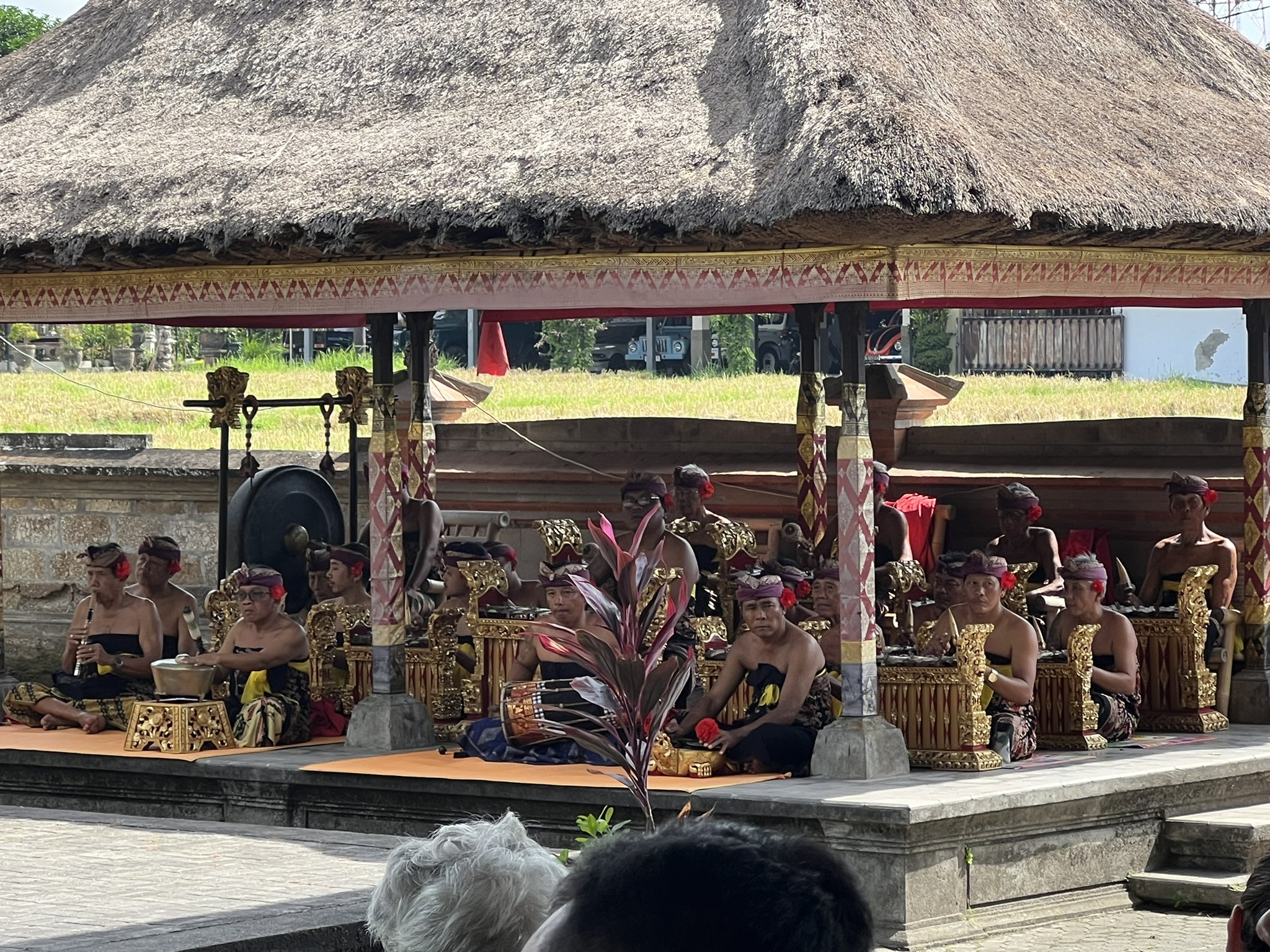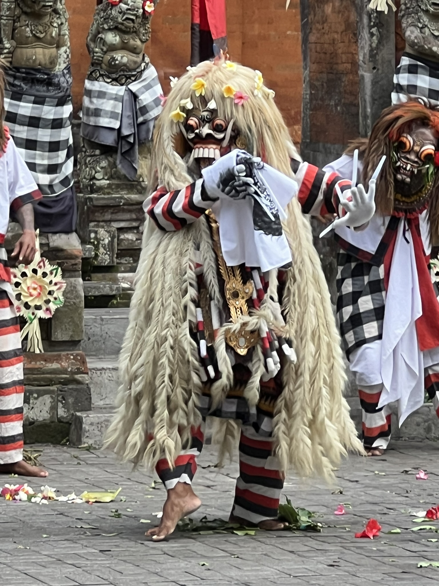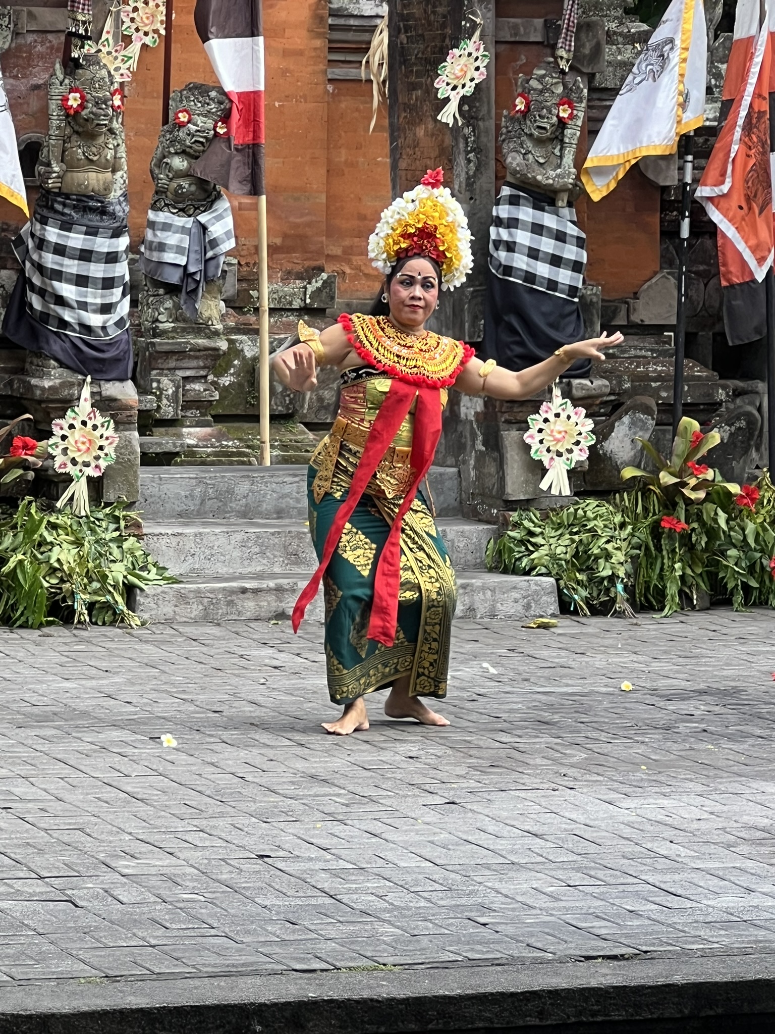Vid vårt första stopp för dagen vilket var i Gianyar, hade vi typ en halvtimme tillgodo innan nån slags dansshow skulle börja. Det var ett fint ställe som nästan såg ut som de tempel vi sett på nätet. När det blev dags betalade vi våra 300.000 IDR och gick in. Det visade sig vara en teater med balinesisk dans. Teatern, The Barong and Keris dance, berättade en legend om hur det goda, Barongen, besegrar det onda, Rangda med hjälp av sina vänner. Allt ackompanjerat av musiker med trummor och flöjter, ganska entonigt.