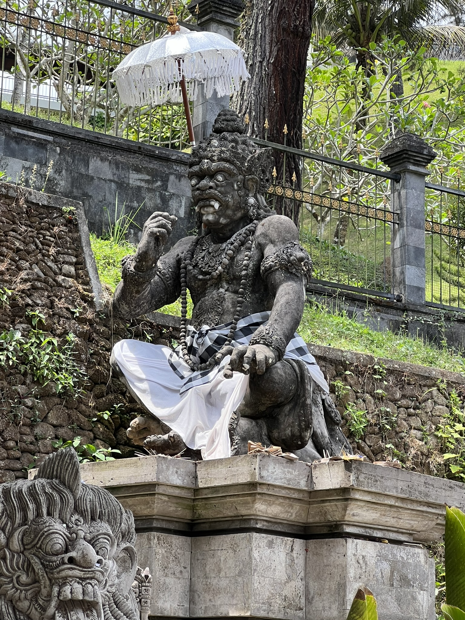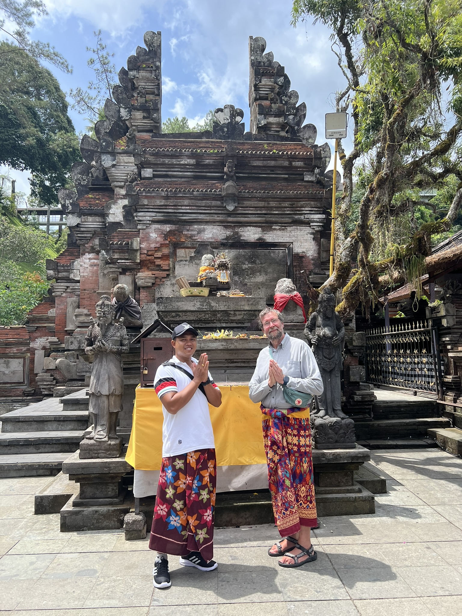 Efter vattenfallet i Tegenungan Village åkte vi vidare mot Balis största vattentempel där det finns heliga vattenkällor. De är hinduer här och enligt Putu går det åt mycket tid till olika ceremonier och till att be. Varje morgon ställs gåvor ut till gudarna i form av små flätade korgar med blommor och ris. De lägger ut fina blommor på trappsteg och trottoarer. Alla statyer får kläder, typ saronger, och blommor bakom öronen eller på huvudet. Just nu är det tre dagar kvar till någon ceremoni som hålls vid fullmåne och alla förbereder sig extra inför denna. Guiden har till exempel en liten bit av ett risstrå bakom örat men många har istället små blommor, även detta för att förbereda inför fullmåneceremonin.