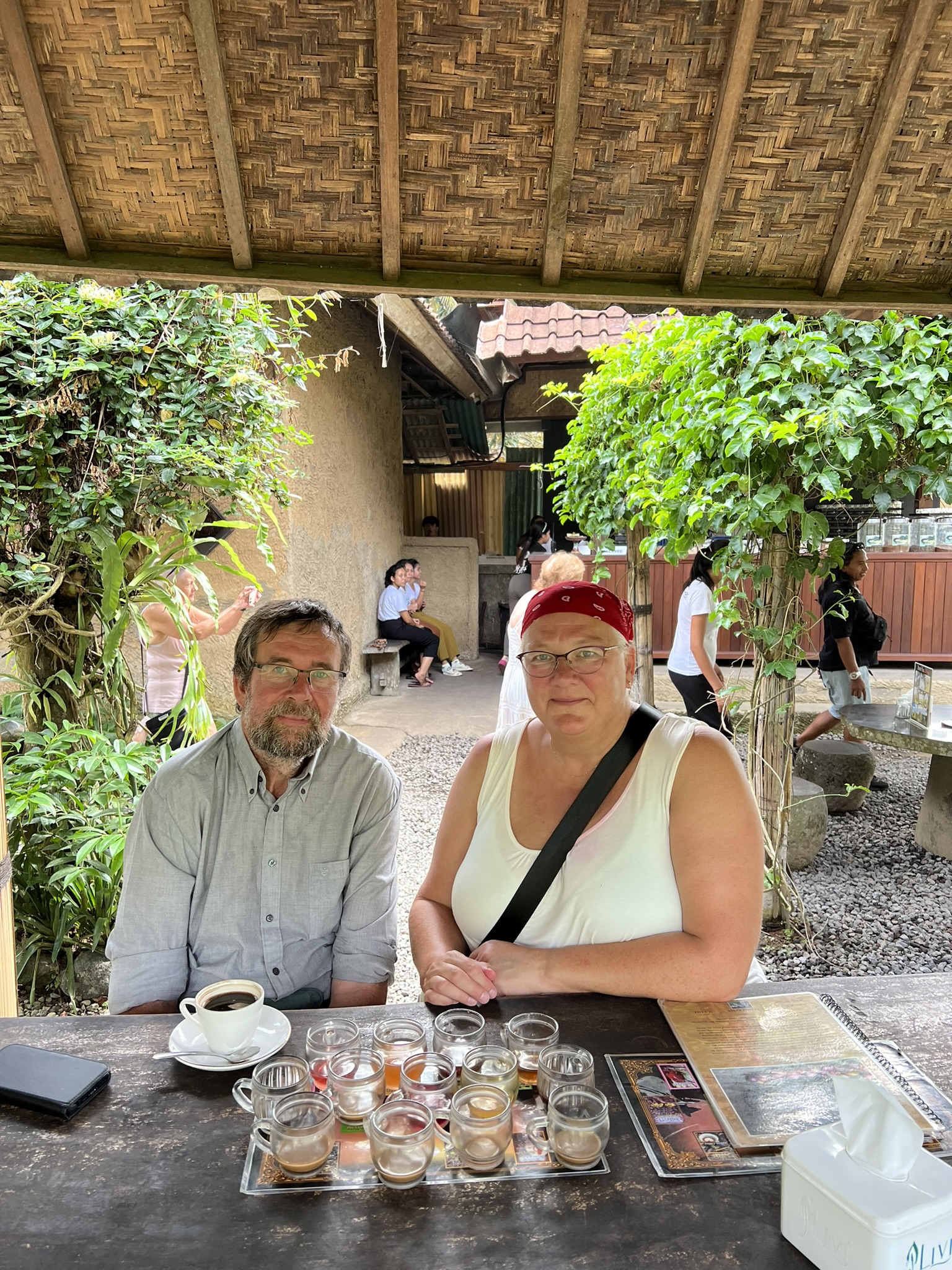 Det hela avslutades med en bricka där vi fick provsmaka ett antal teer och kaffesorter. Det exklusiva Luwakkaffet fick vi dock betala 50.000 IDR för om vi ville smaka. Det är ju bara typ trettiofem kronor så det gjorde vi såklart. Jag tyckte det smakade bittrare och surare än det kaffe vi är vana vid. Vet inte om jag tycker det var så fantastiskt gott direkt. Men kul att ha smakat!