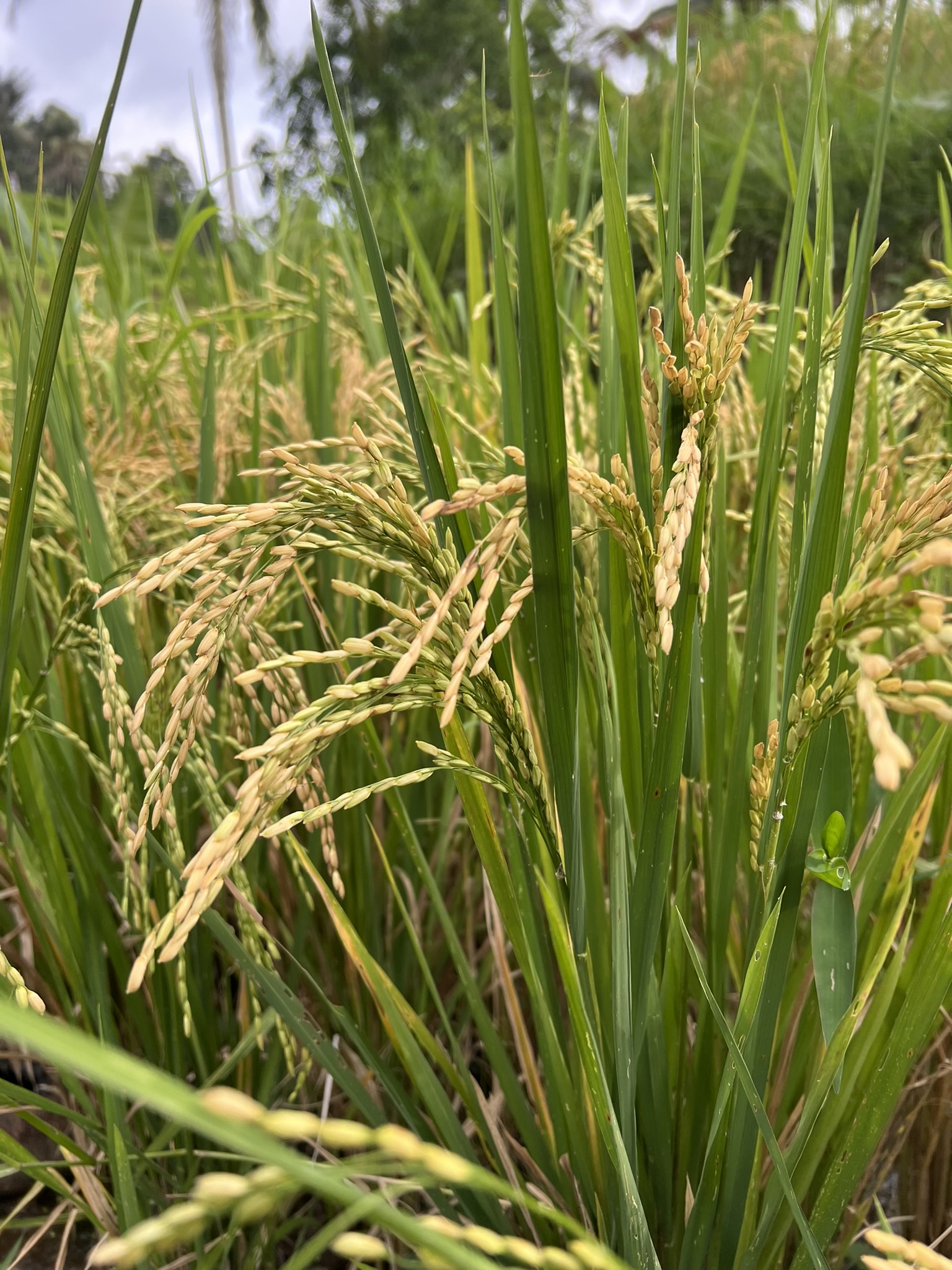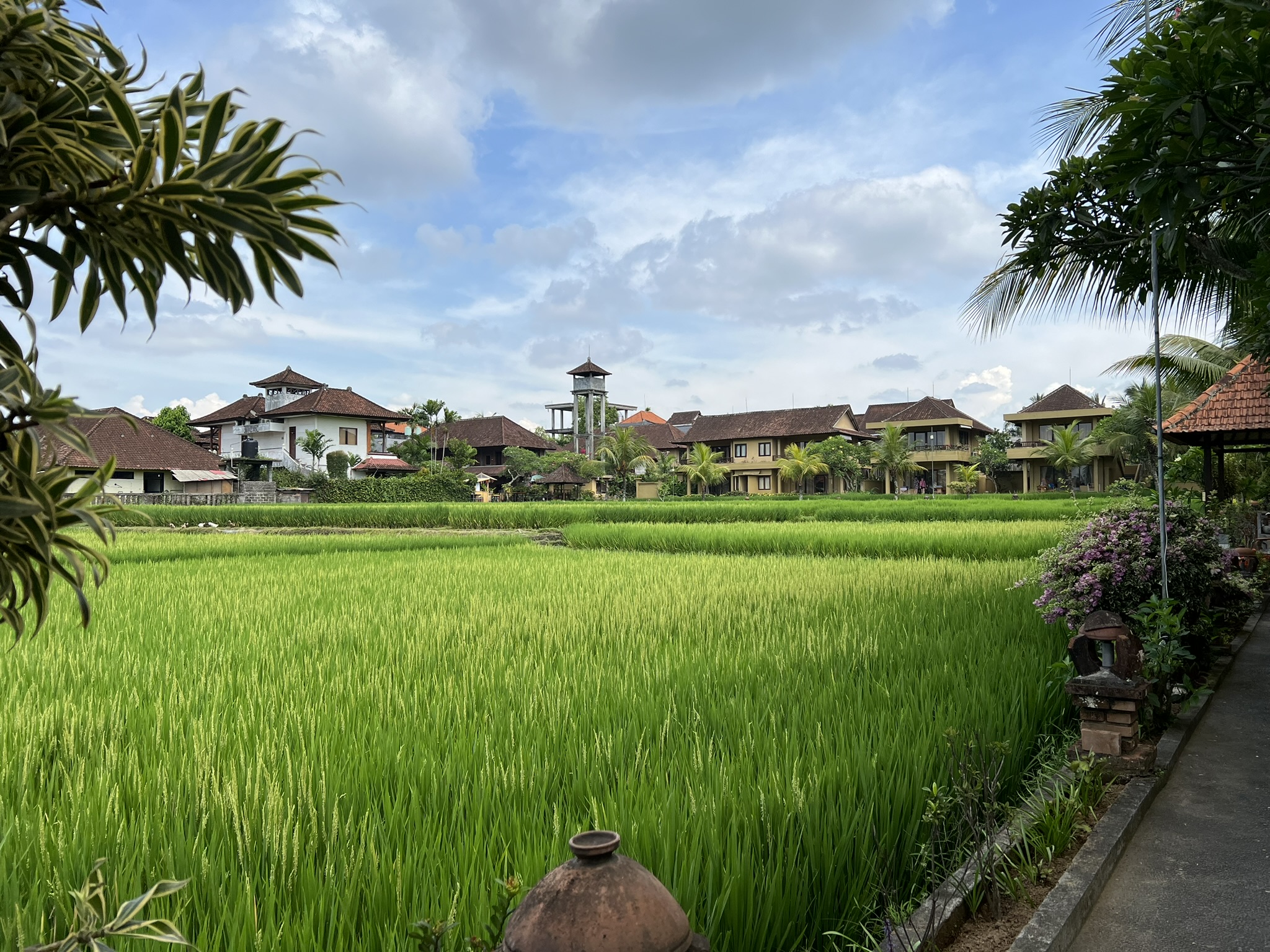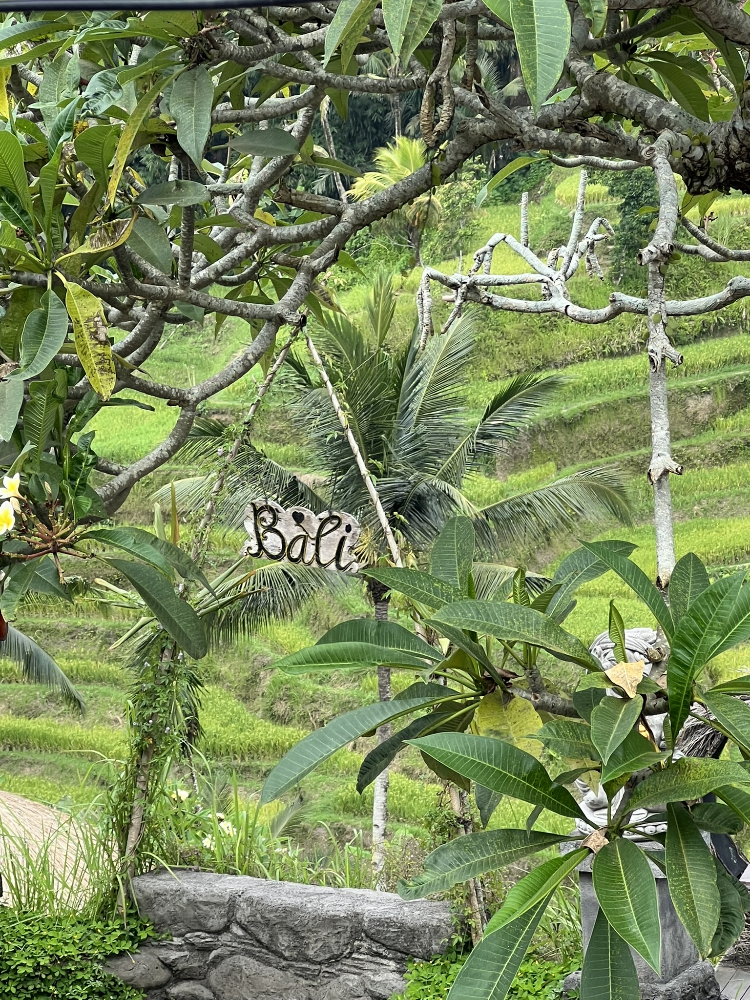 Nu var det bara risterasserna kvar att besöka. Och visst var det vackert och annorlunda men fasligt vilken turistindustri det blivit. Liksom vid vattenfallet fanns det olika platser där man kunde ta kort och betala en slant i donation. Det fanns också flera Balinesiska ”risfältsarbetare” i klassiska hattar och med riskorgar på en bambukäpp som låter sig fotograferas mot betalning. Inga stora pengar men ändå.