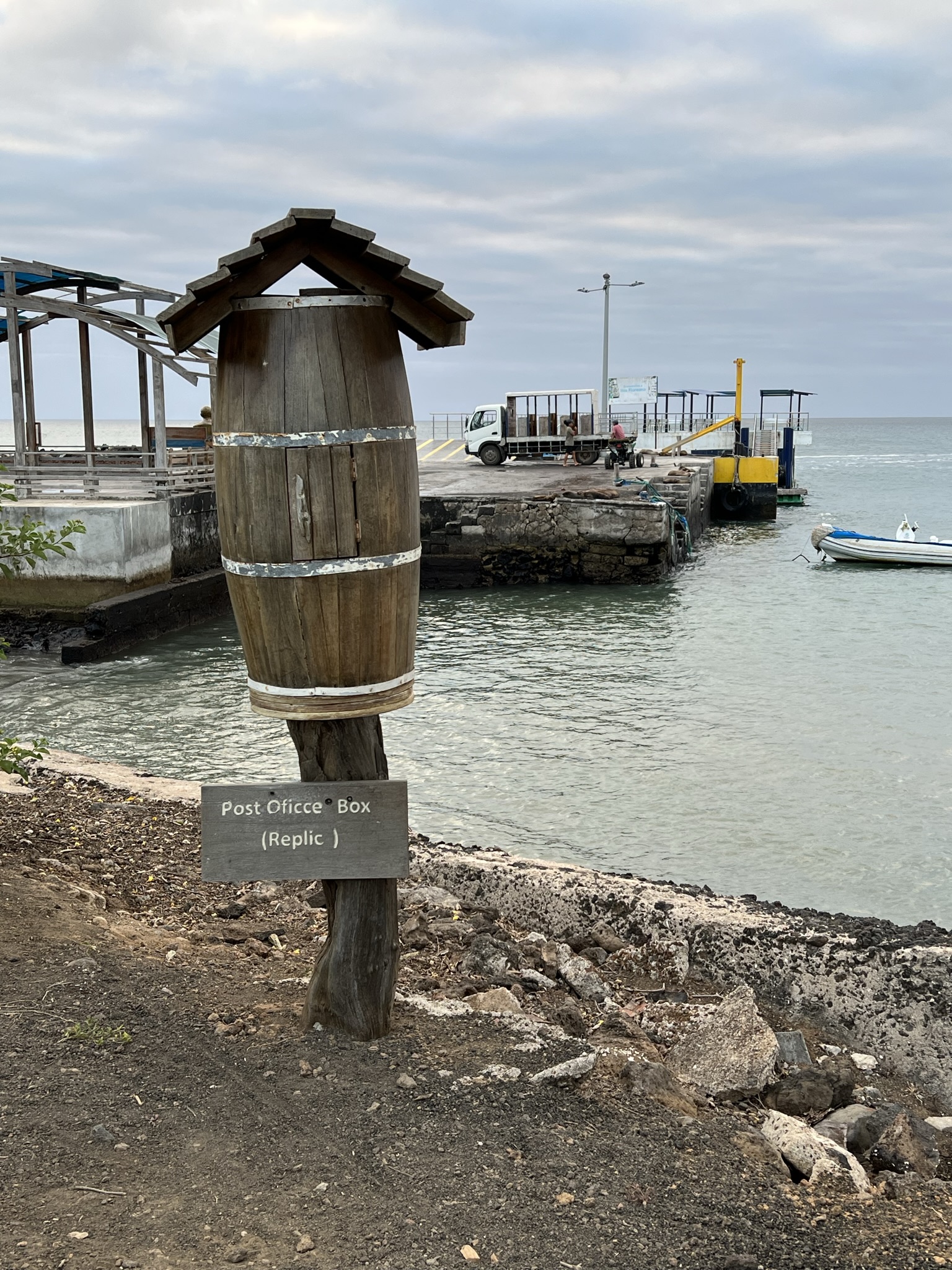 Det var en gråmulen och lite regnig morgon men varm! Inte som de kalla stänka av regn man får i ansiktet på väg till jobbet en torsdagsmorgon hemma i Sverige! Guiden påminde oss om att på vägen till båten kolla in posttunnan om det fanns någon post vi kunde ta med oss och lämna personligen till adressaten vilket det enligt traditionen ska göras. Vi hittade dock inga från Sverige så vi lät breven ligga kvar till någon annan kurir.