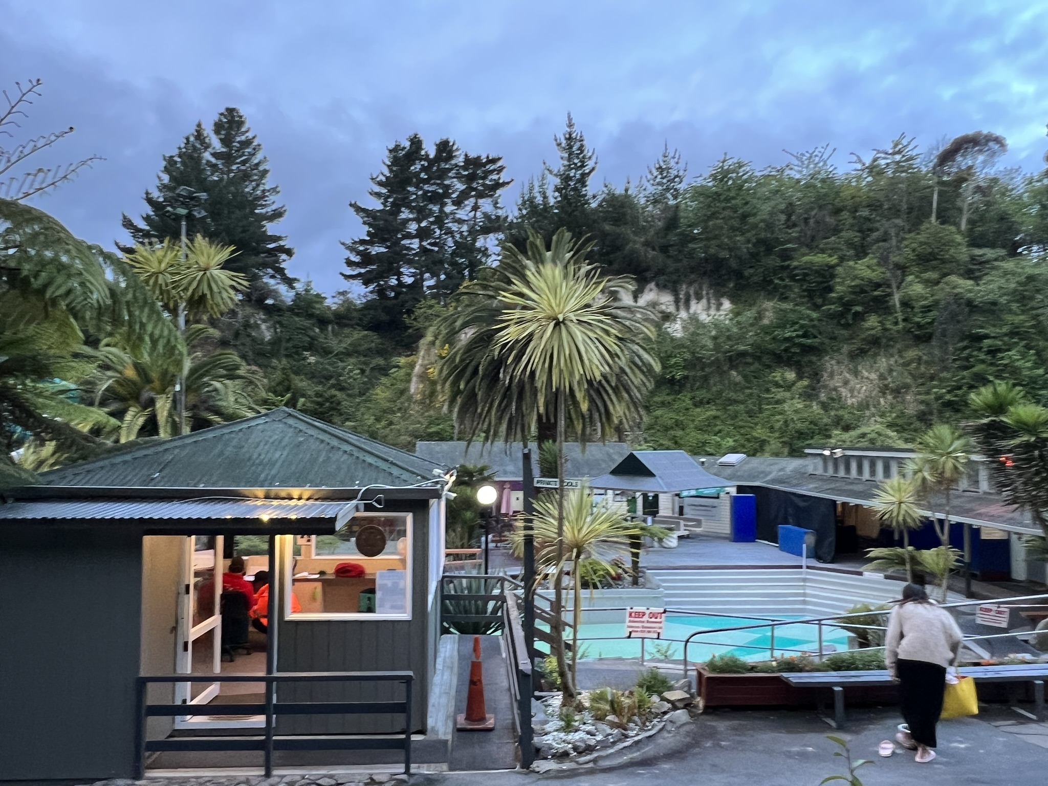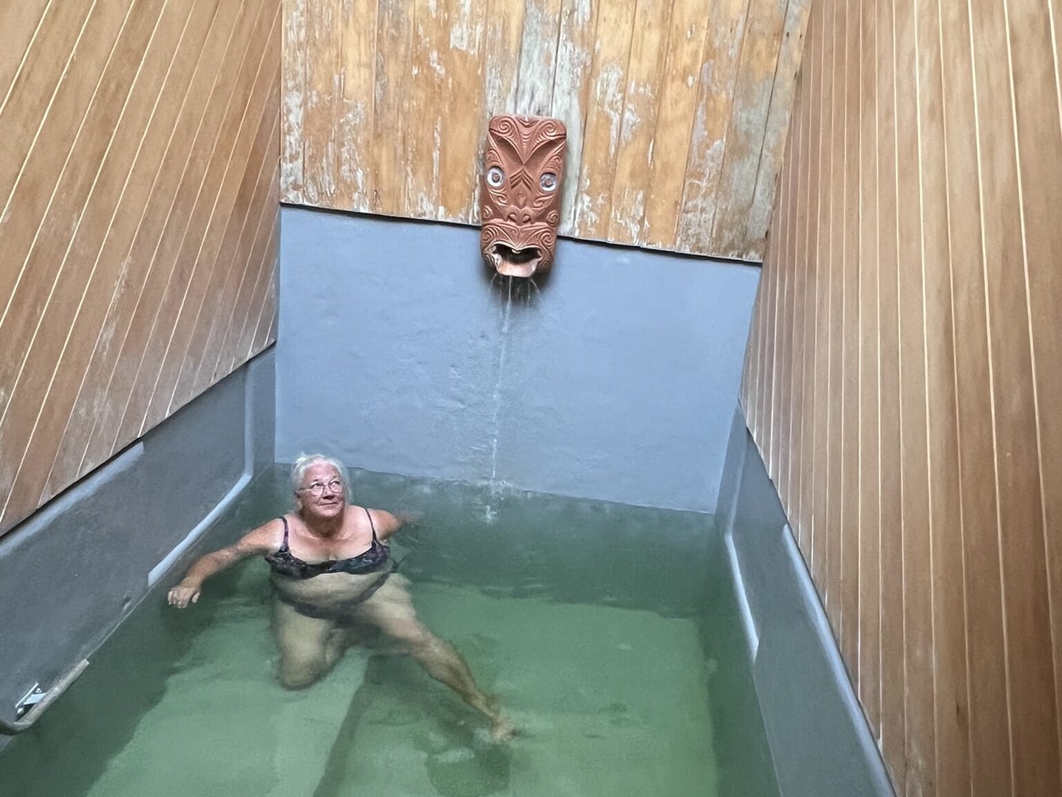 När vi närmade oss Taupo började det dyka upp ångpelare här och var i omgivningen. Det visade sig vara termiska källor. Liksom på Island leds de mineralrika varma källorna till bassänger som används för välgörande bad. Vid campingen fanns en av de goa varma källorna som blivit bassäng. Härligt för stela vindpinade muskler. Vi började med en privat liten pool som var strax över trettioåtta grader. Åh, så gott det var! Vi fortsatte sedan till de andra utomhusbassängerna som också var varma och goa.
