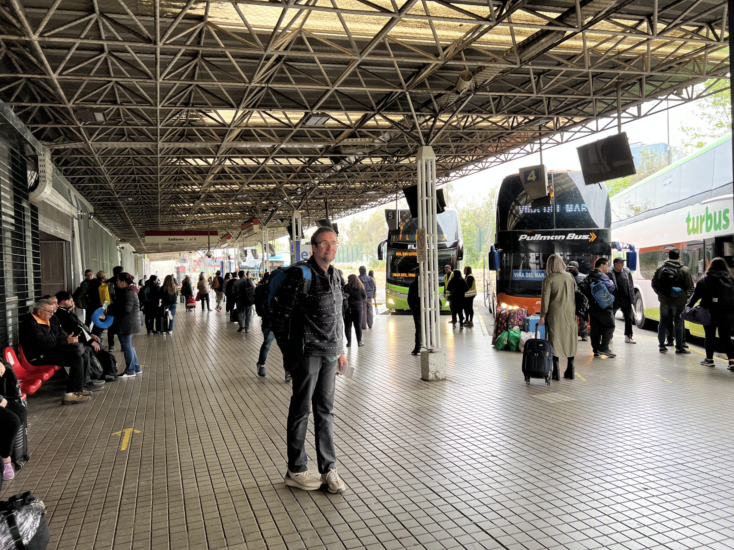Tunnelbanan tog oss över nästa hela Santiago och busstationen låg alldeles vid utgången av stationen Pajaritos. När jag googlat lite kring resan till Valparaiso så hade jag råkat hamna på hemsidan för Pullman så det var det bussbolaget vi valde. De hade avgångar var 15:e minut när vi kom dit vid elvatiden så det var inte lång väntetid. Vår basala spanska räckte också fint för att få biljetter. 10 000 pesos för två personer (ca 120 kr) var väl överkomligt kan jag tycka.