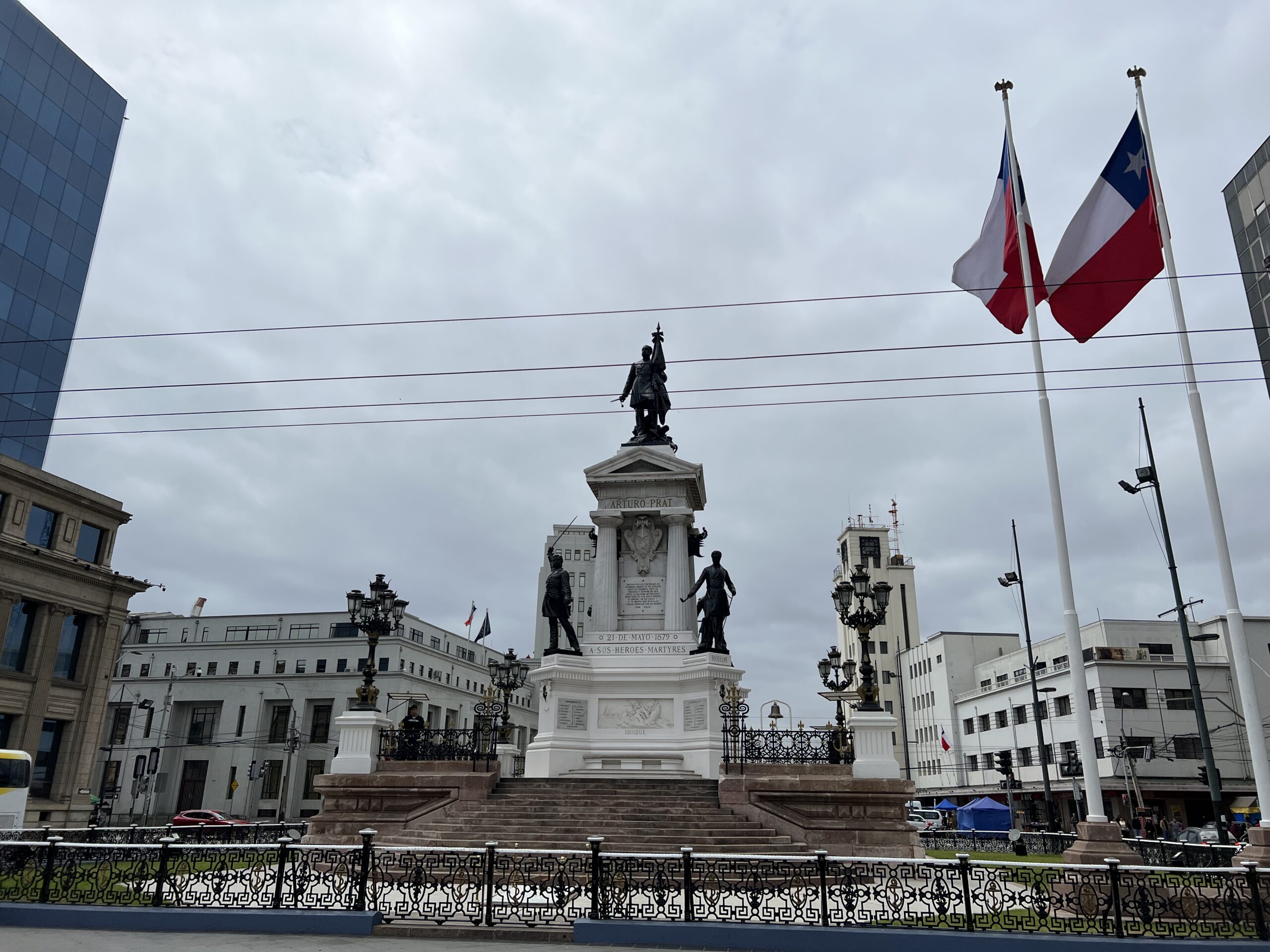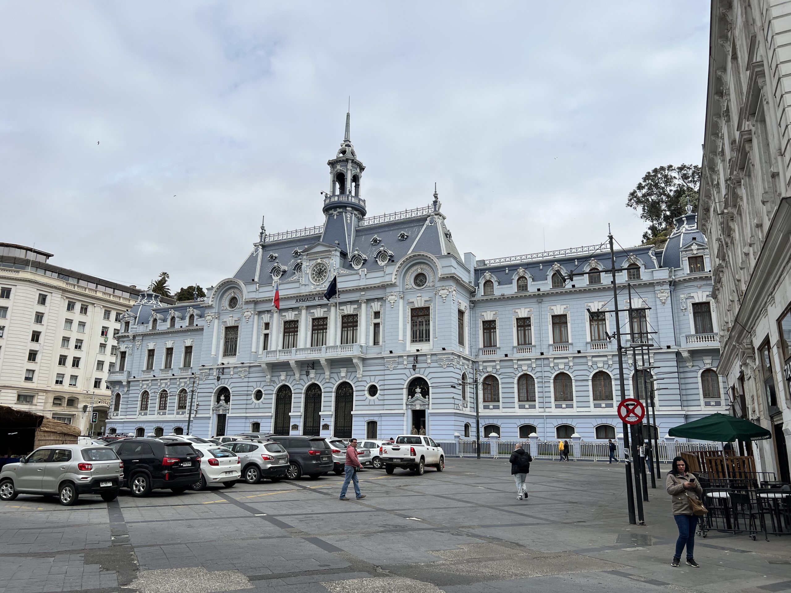 Vi började att följa den utritade guideturen på kartan vi fått. Slutet låg vid vårt hotell så det var bara att följa vägen baklänges. Vi passerade ett torg med Monument a los Héroes de Iquique och gick vidare mot marinens högkvarter. Minns jag rätt var det väl härifrån militärkuppen startade på sjuttiotalet.