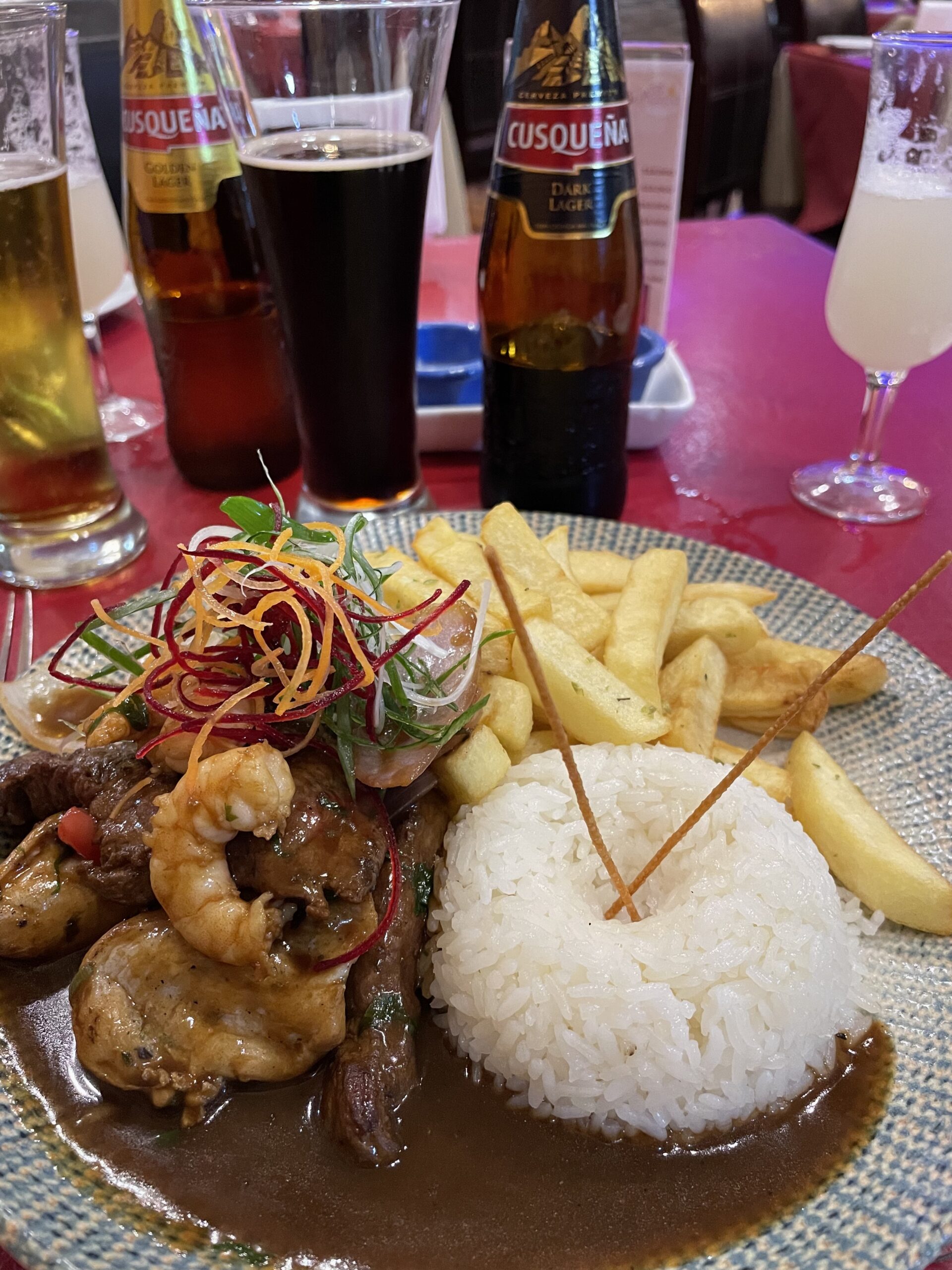 Som vanligt ligger våra middagstider långt före alla andras i Sydamerika men vi blev ändå visade till ett bord i den i övrigt tomma restaurangen. Vi testade Pisco och åt varsin utmärkt maträtt med Peruanskt tema. Vi blev väl ännu mer övertygade om att vi måste återvända till Sydamerika och då besöka Peru också.