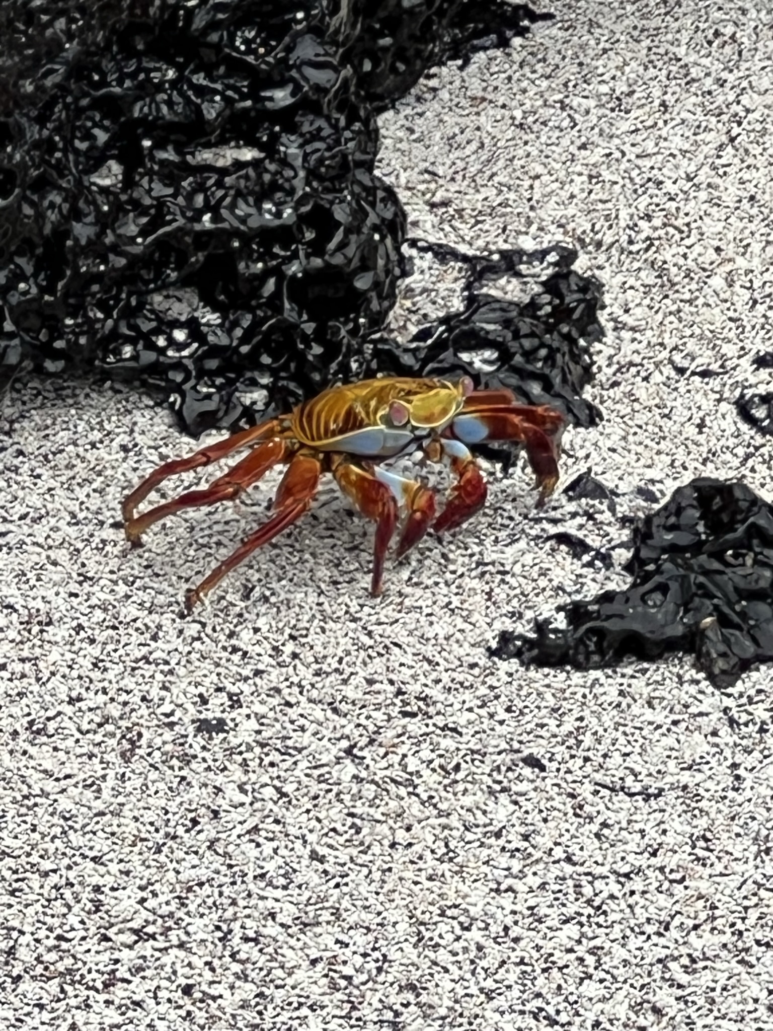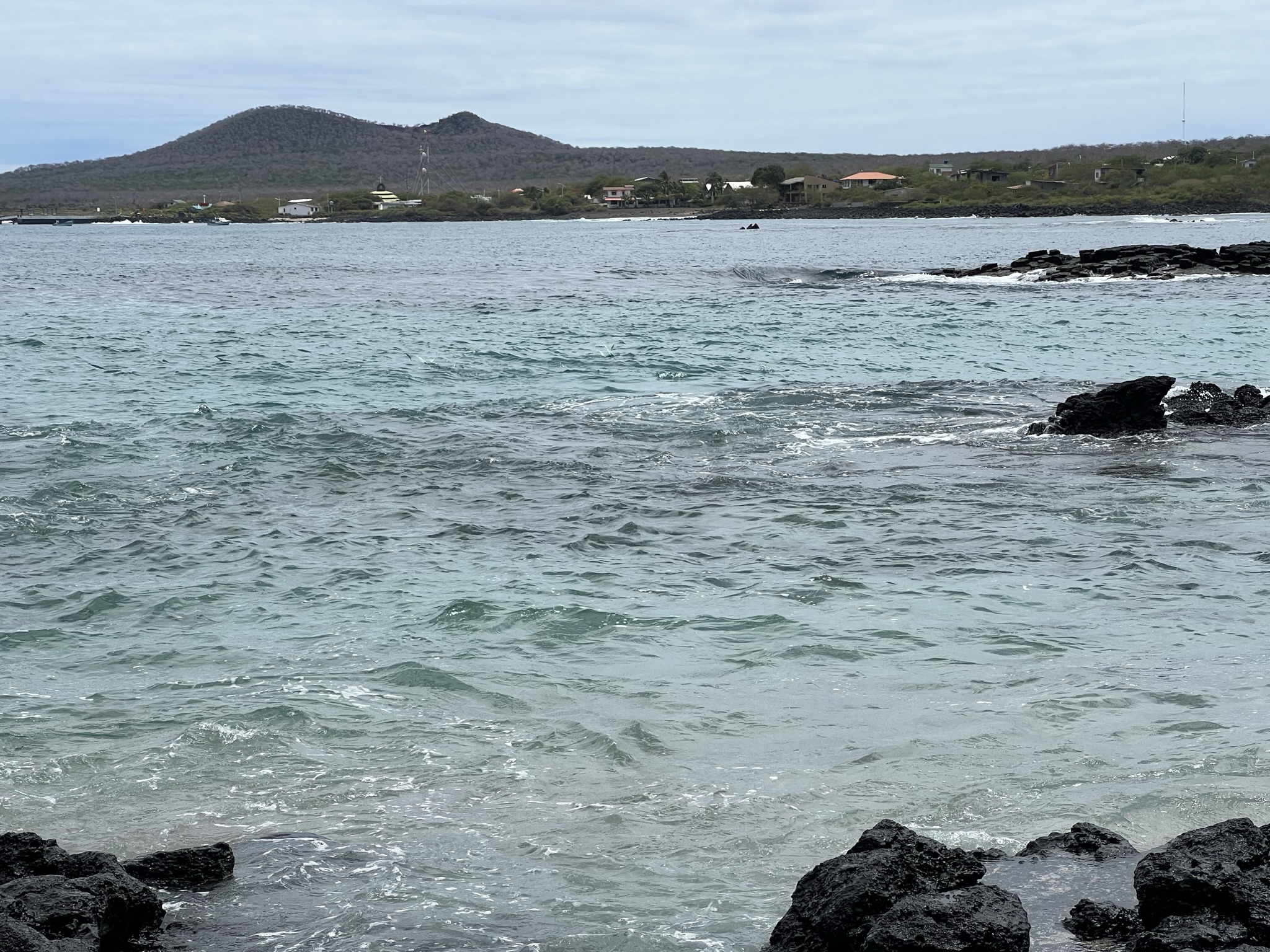 Plötsligt ropade guiden till och pekade ut tre Galápagospingviner som susade fram i vattnet. De är verkligen supersnabba. Oj, vad vi önskade att de hellre borde stannat till på stranden och hälsat på oss. Men de höll sig på behörigt avstånd, så det var bara att vandra vidare. Galápagospingvinen är den näst minsta pingvinarten och är starkt hotad. Ett problem är den ökande havstemperaturen.