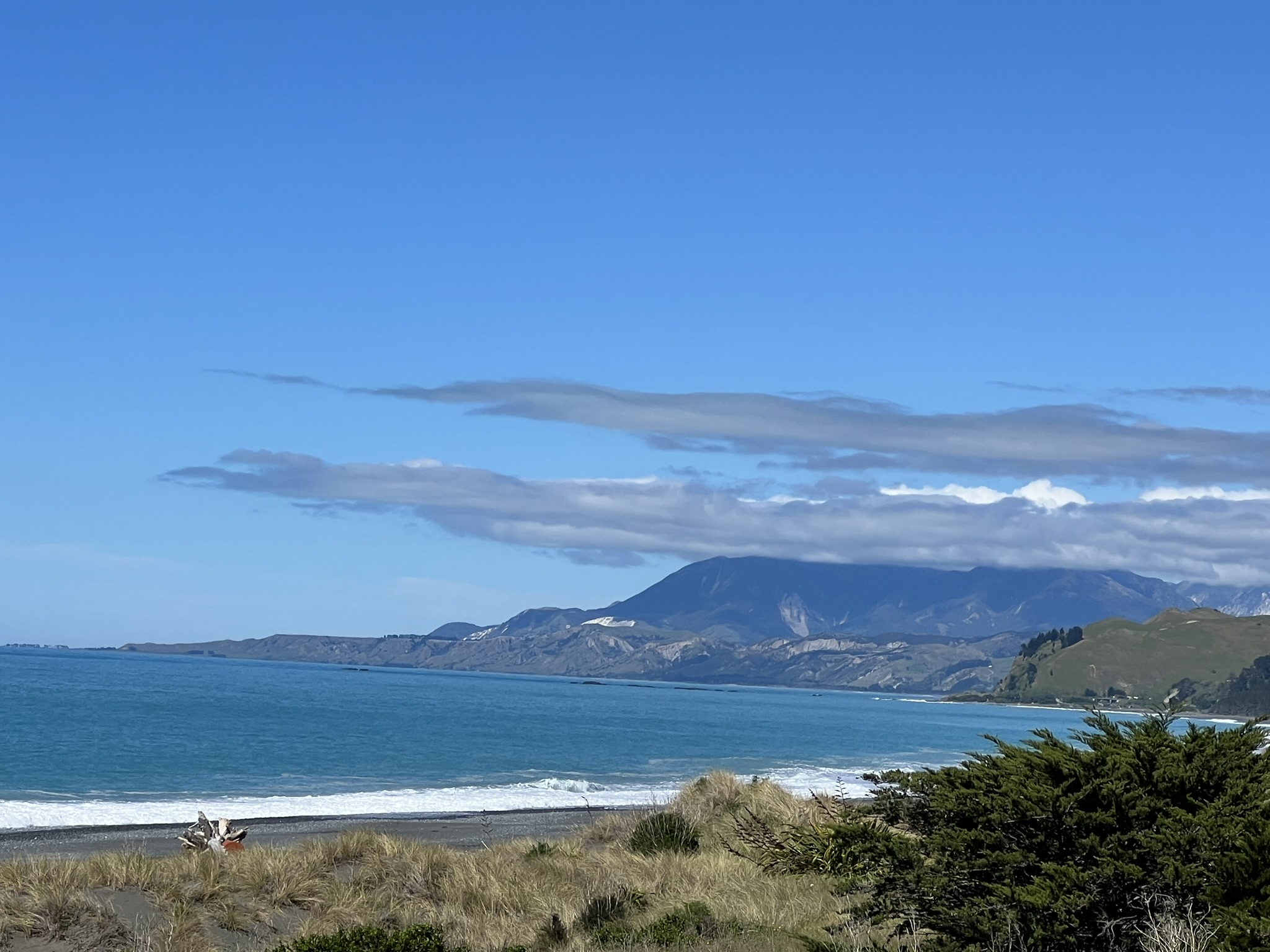 Kusten vi for längs hade drabbats av en jordbävning 2016 som lyft delar av terrängen ett par meter. När vi körde här kunde man inte märka mycket av det eftersom vi saknade referenser men vi fick tänka att kusten var högre och annorlunda nu helt enkelt. Och att vi lever oförskämt säkert hemmavid utan tanke på att sådana katastrofer kan inträffa när som helst och utan förvarning.