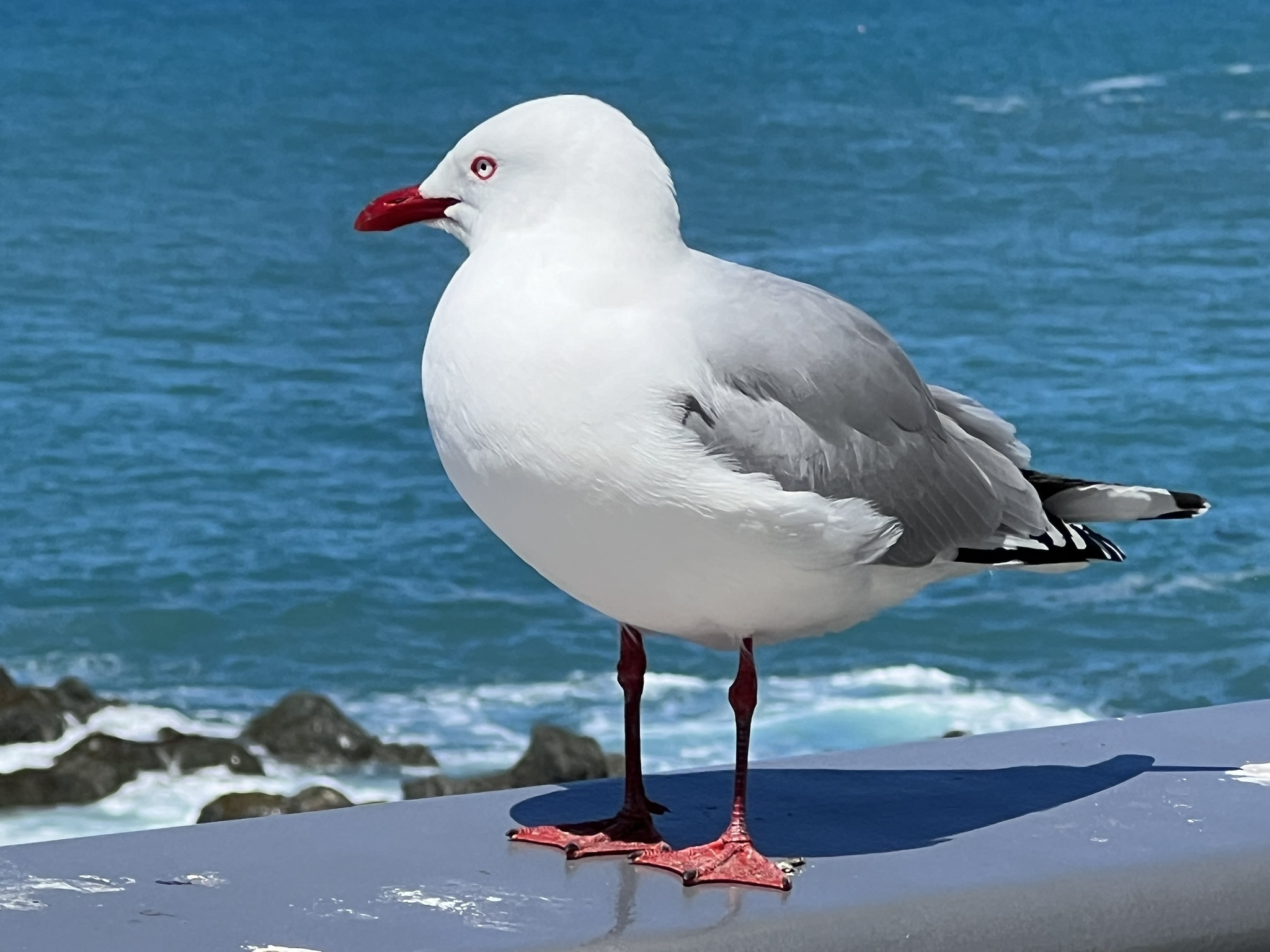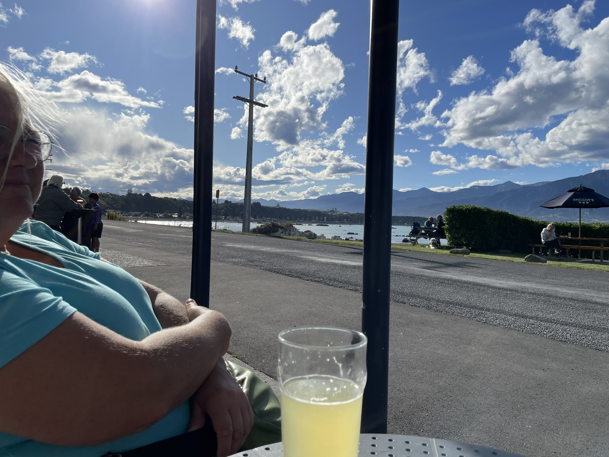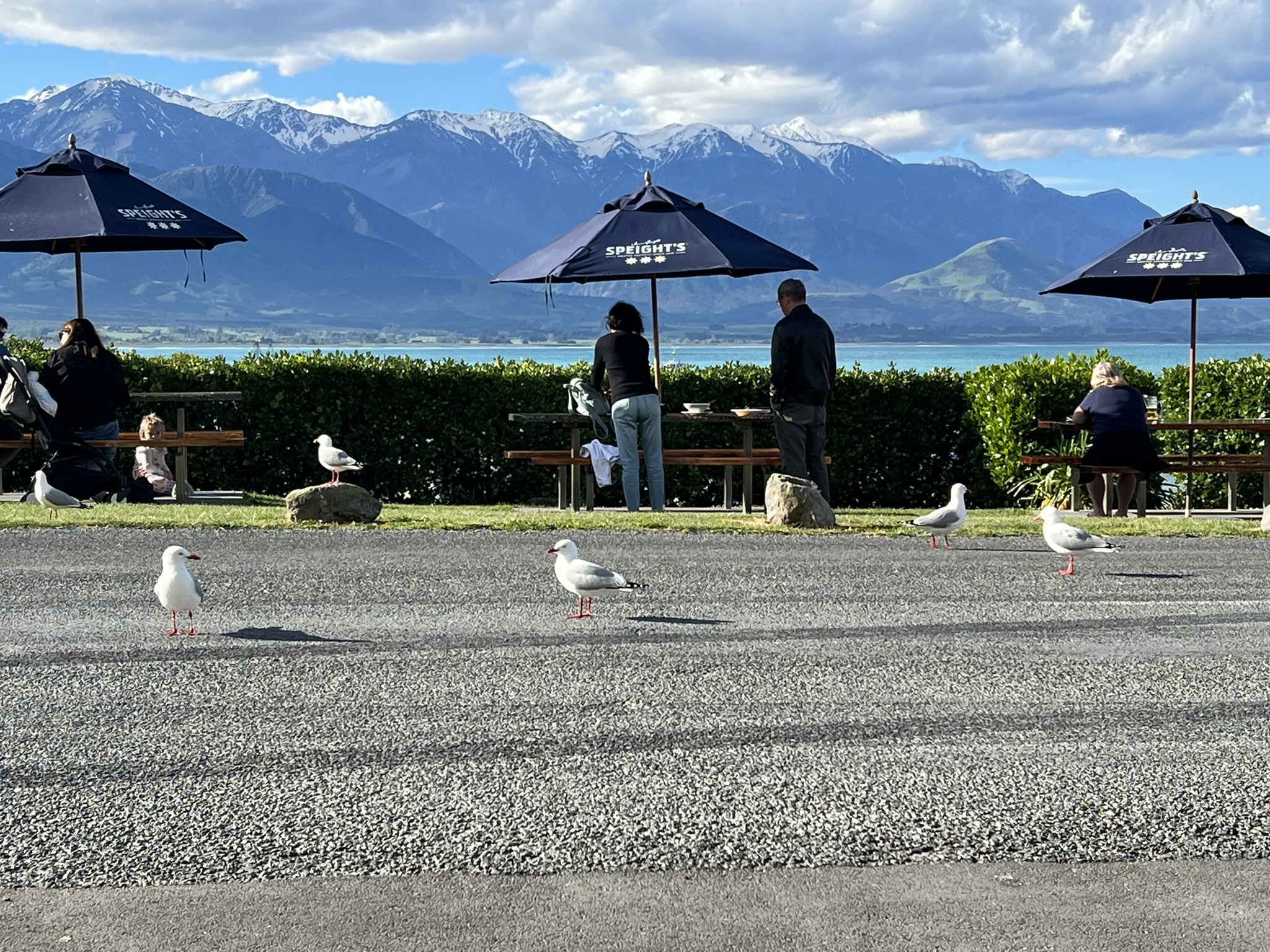 Guiden sa att vi var helt tvungna (tolkade det som ett absolut krav faktiskt) att vi måste passera The Pier Hotel på vägen tillbaks för att åtminstone ta en öl. Helst skulle vi äta men hon sa att där äter all lokalbefolkning om lördagarna så det brukar vara fullbokat. Det såg onekligen fullbokat ut. Vi frågade inte men en öl i solen med det snöklädda bergen som fond funkade ju det också. Kul var också att se en kinesiskt man som försökte freda sin mat från hungriga rödfotade måsar (de har knallröda fötter och näbbar här). Det gick sådär för honom.
