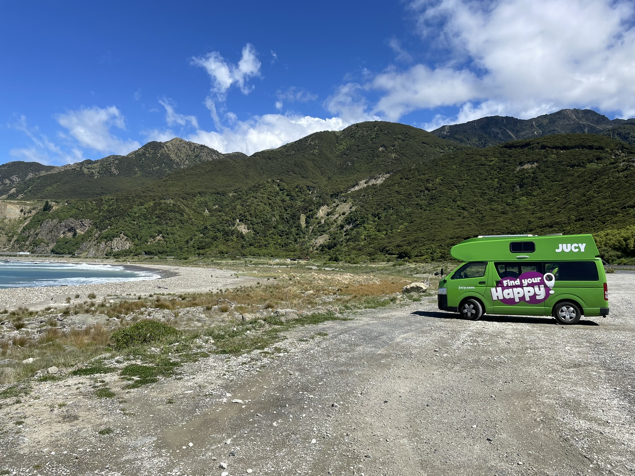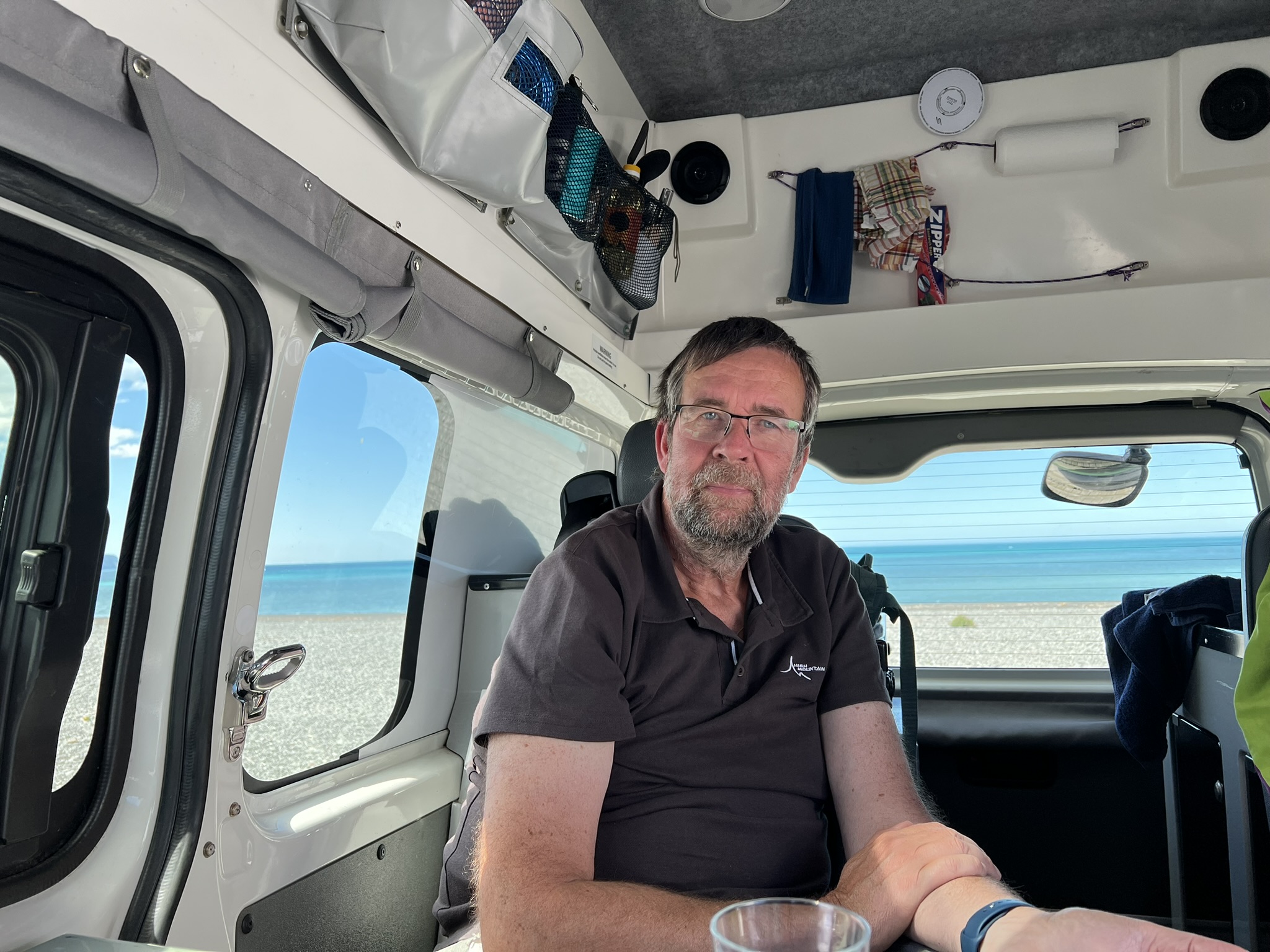 Dit styrde vi och fick den näst sista platsen. Att kunna öppna bakdörren och titta rakt ut på en stilla och solig havshorisont är väl vad jag såg framför mig när vi bokade en campervan för del här delen av resan. Så jag kände mig inte helt missnöjd alls faktiskt.