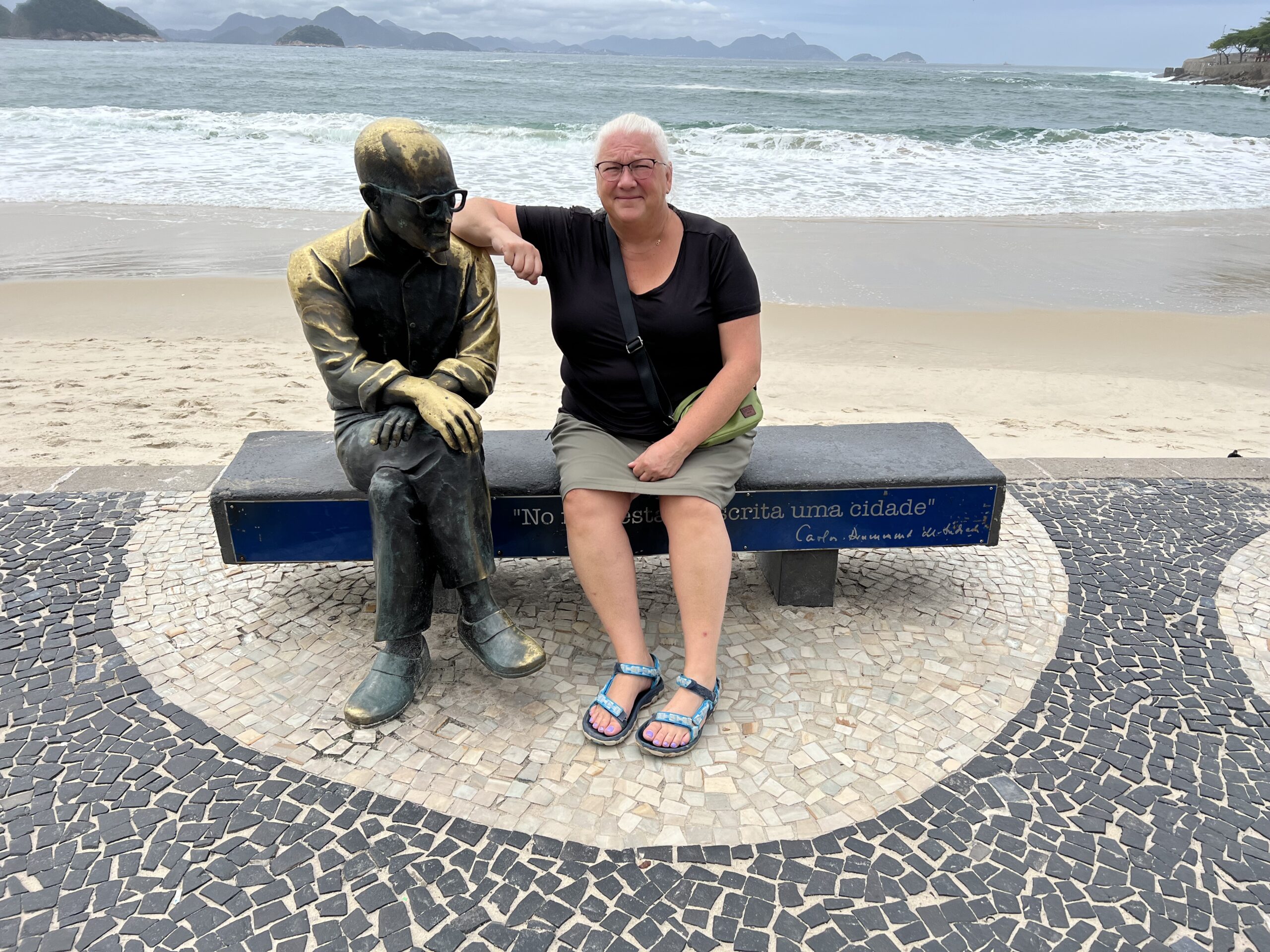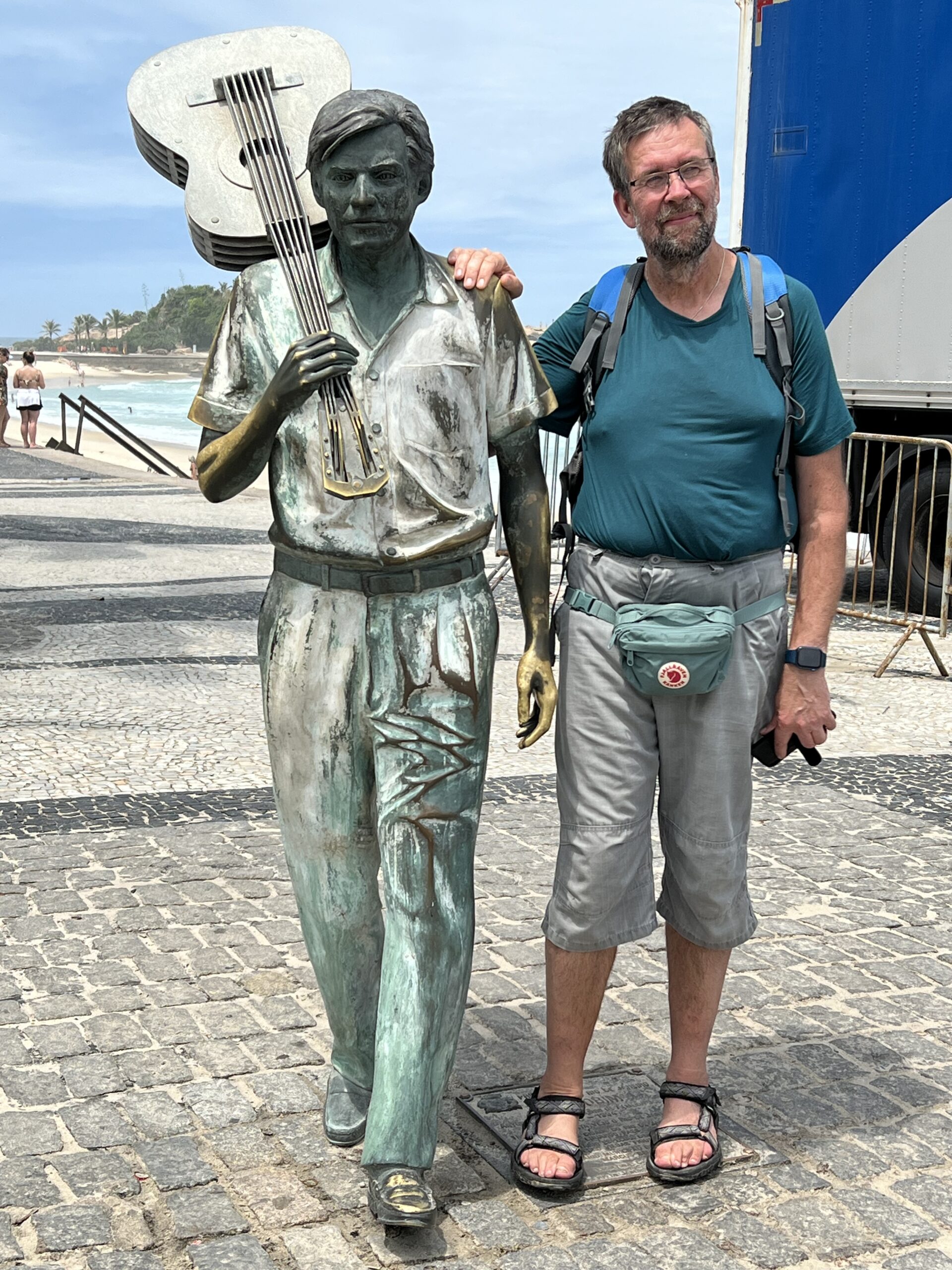 Till en början återvände vi till änden av Copacabana. Där ligger en adventurecache som vi startade upp. Vi fick då en tillhörande historia till de två statyer vi noterat längs promenaden första dagen vi var här. Sån är alltid intressant. Vandringen tog oss sedan till Ipanema och en sista staty.