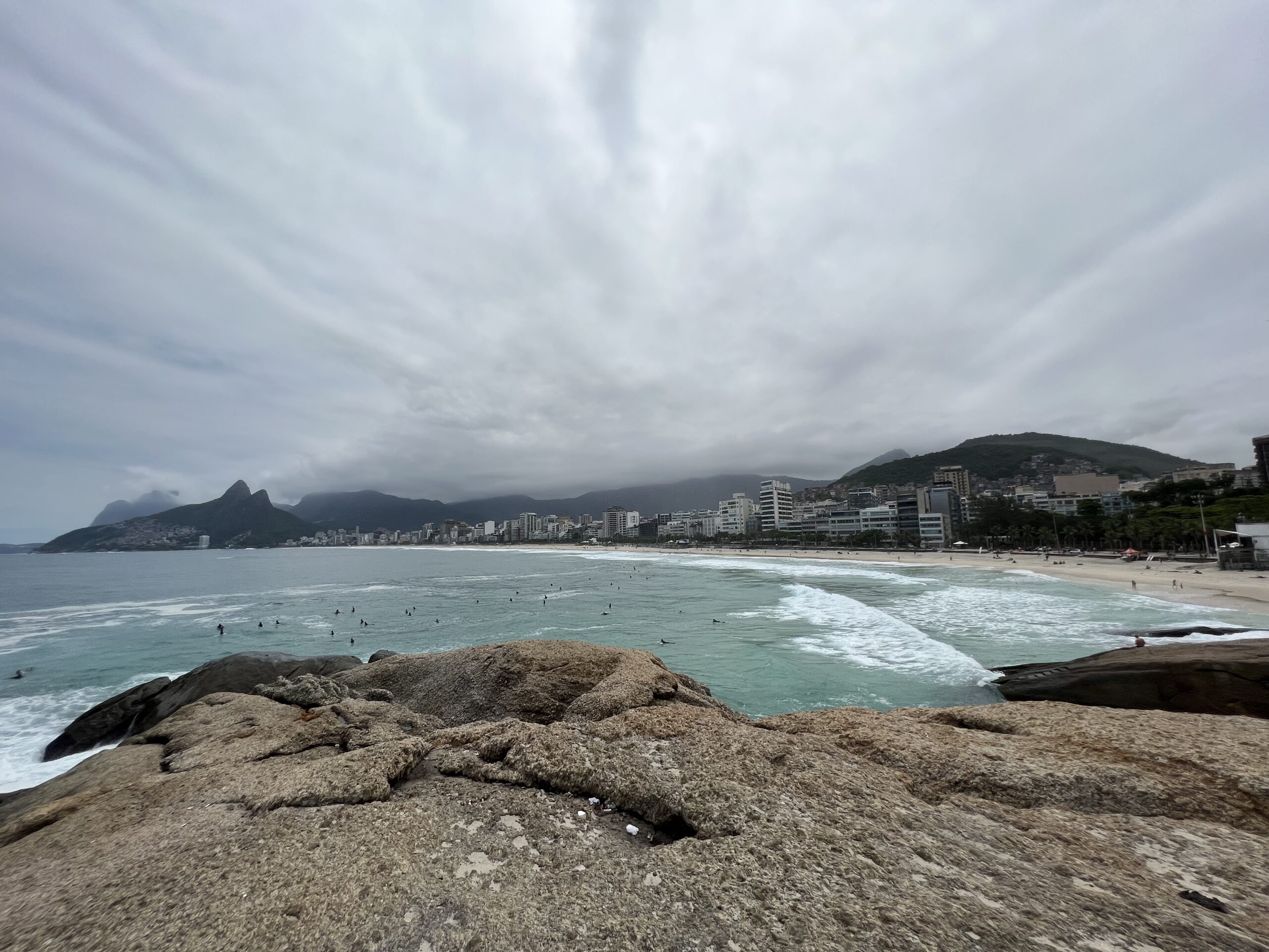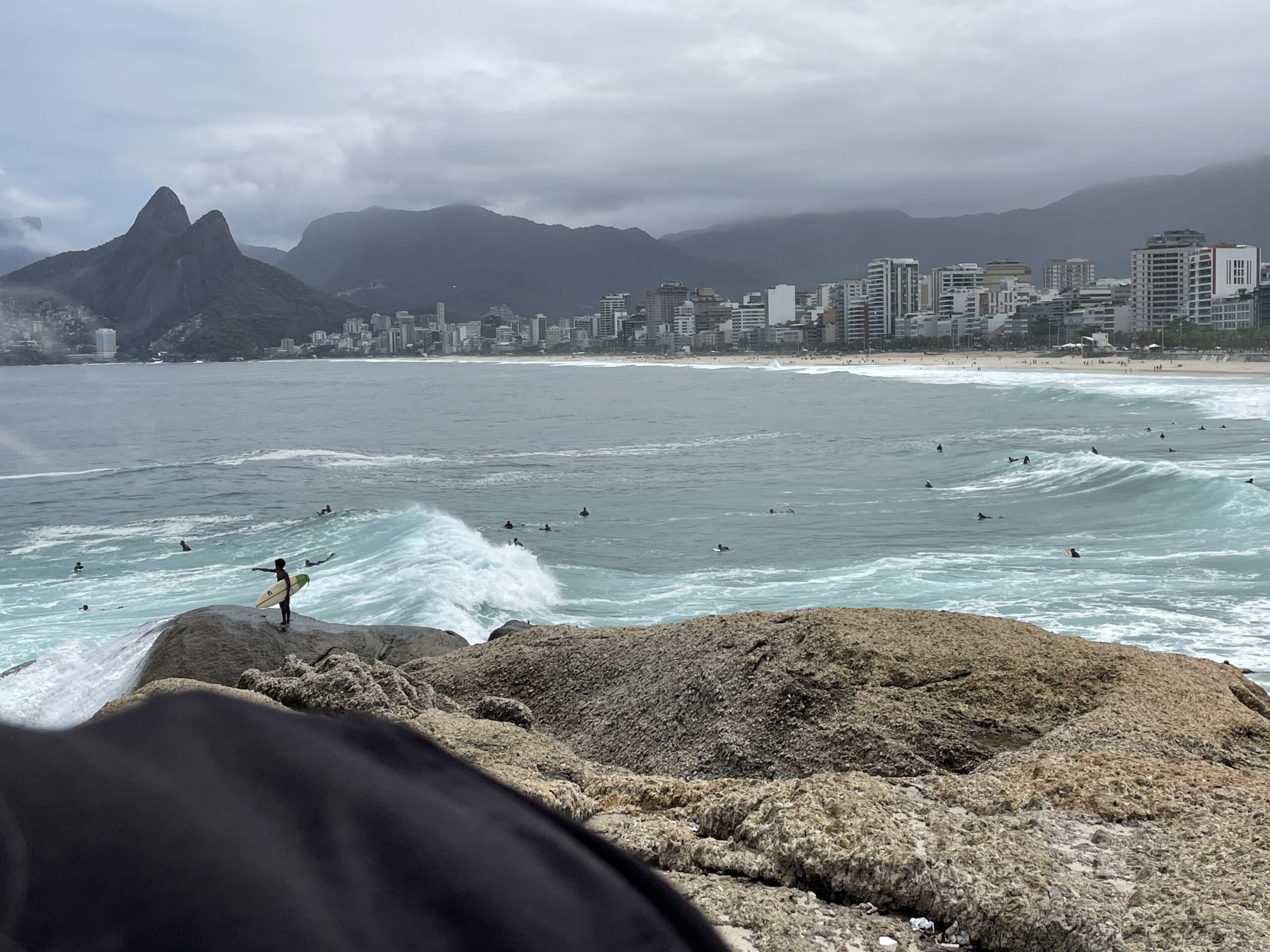 Tittar man istället åt höger finns det en kortare remsa stand kvar och längst åt höger slutar stranden vid Pedra do Arpoador. Det är en klippa som sträcker sig ut i havet. I vattnet utanför lär det vara bästa stället för surfing i Rio och vågorna som slog i närheten gjorde det enkelt att förstå att så nog var fallet. Att se solen gå ner i havet är svårt här i Rio eftersom det västerut är land. Men en tid runt sommarsolståndet går solen ner i havet från den här klippan och då samlas folk för att titta på det. Och tydligen jublas det och klappas i händerna när solen når under horisonten.