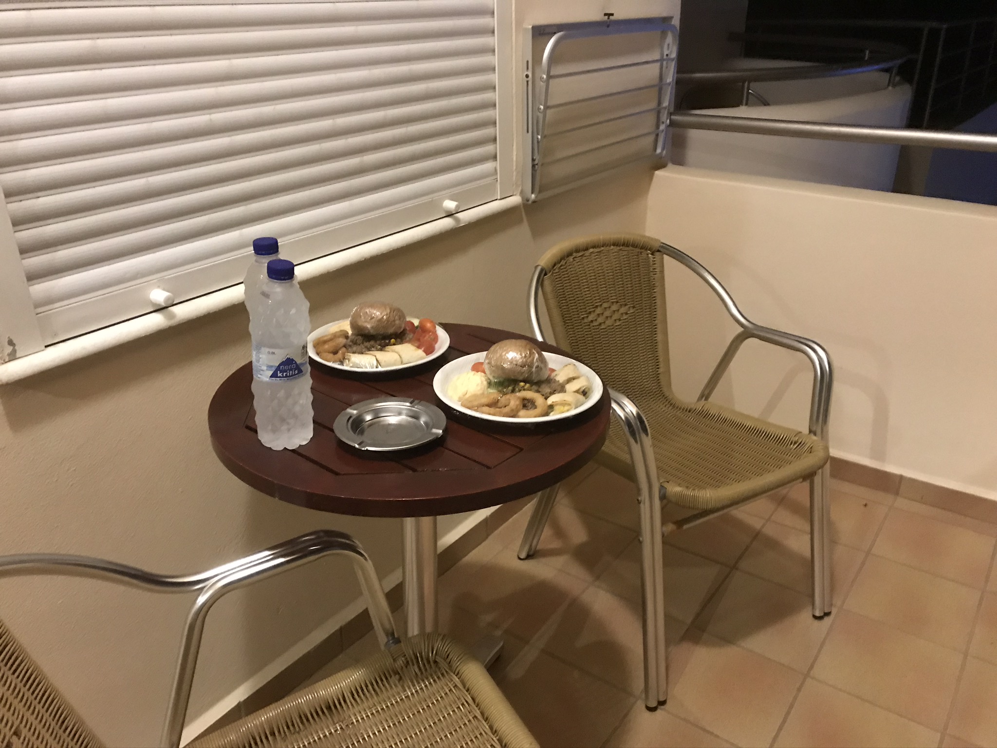 Flygtiderna var väl inte de bästa men det var ganska billigt! Vi kom fram till hotellet, Maleme Mare Beachside Hotel, vid 01:30 på natten. Trots att klockan var mycket hade de ordnat en tallrik med godsaker och ett par kalla flaskor vatten som vi intog på vår balkong. Även om det var en konstig tid att äta på var man ganska hungrig efter en lång resa utan någon direkt middag.
