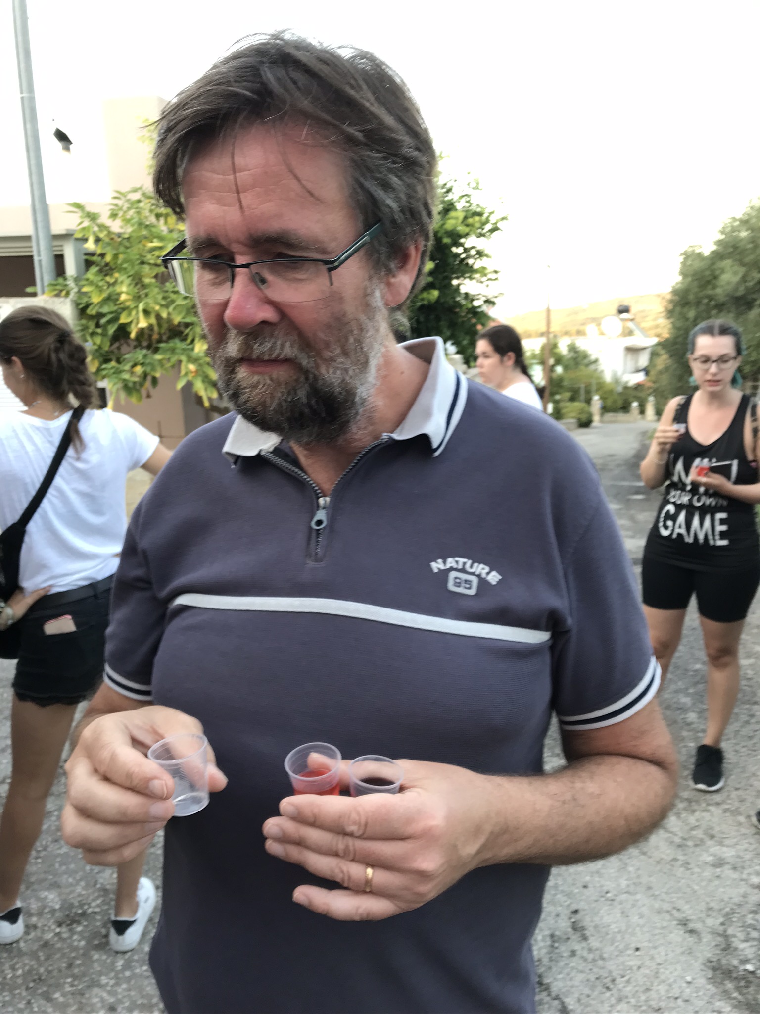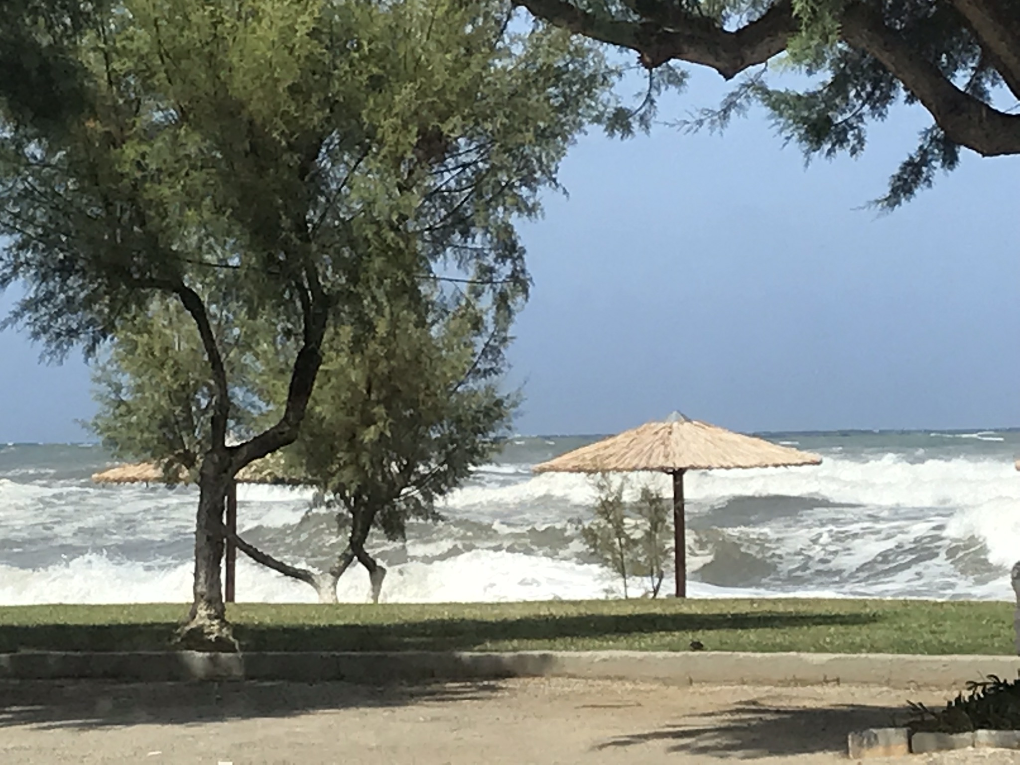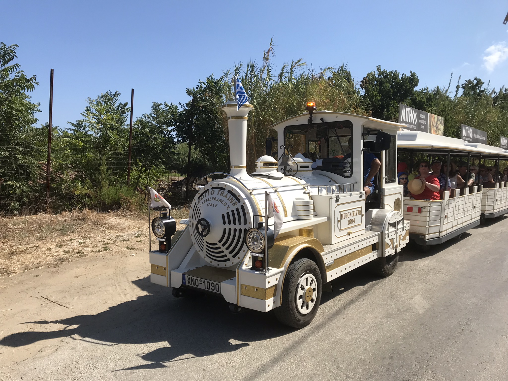 Sedan gick det lilla tåget vidare mot Polemarchi där vi skulle få se hur de trampade druvor som skulle bli Raki. För de som ville ingick även smakprov på både Raki och olivolja. Raki föll oss inte direkt i smaken, men nu har vi ju i alla fall provat! Färden gick därefter vidare längs kusten hem till hotellet igen. Efter en dag full med intryck satt vi på vår balkong och tittade på det upprörda havet.