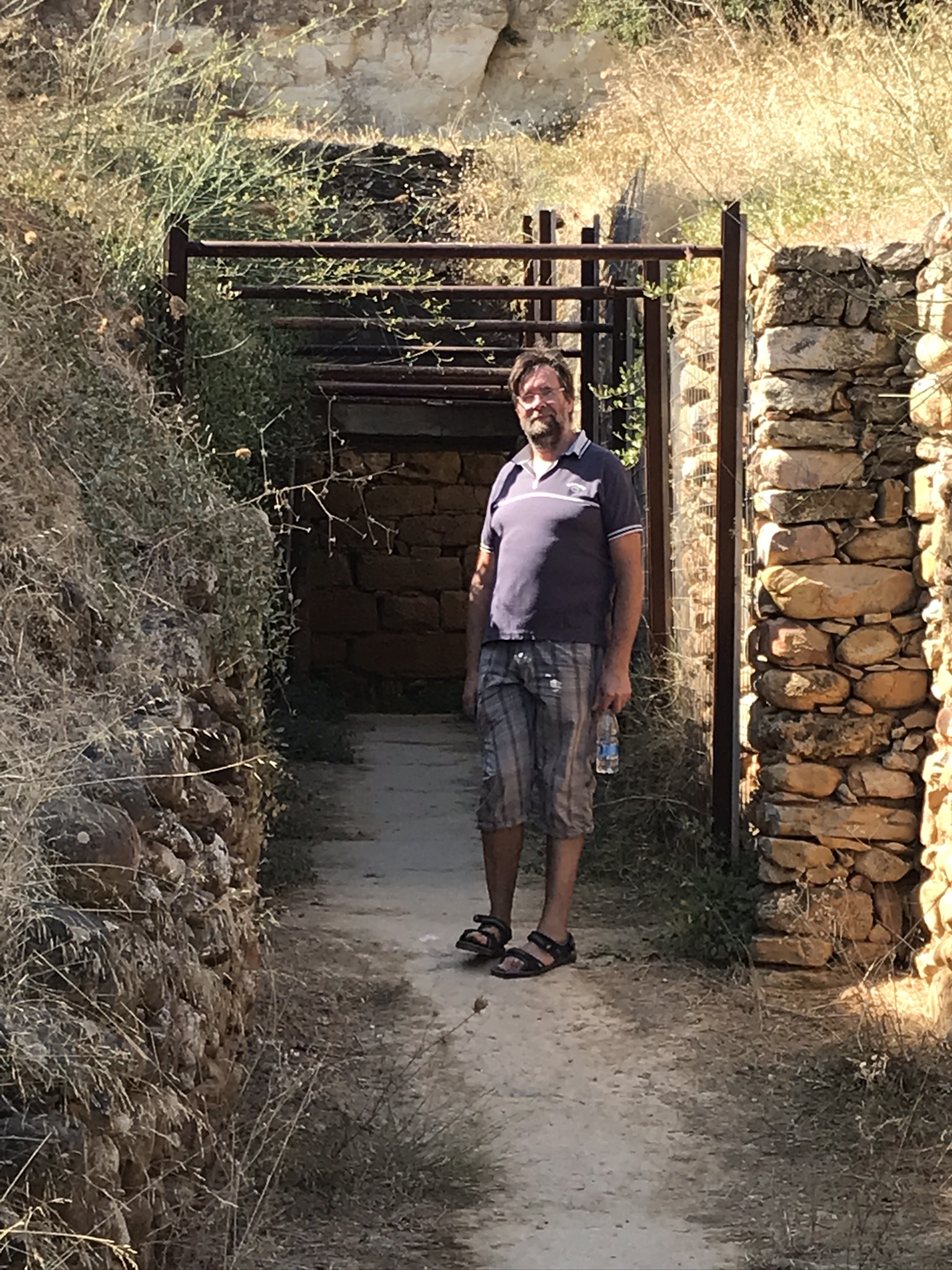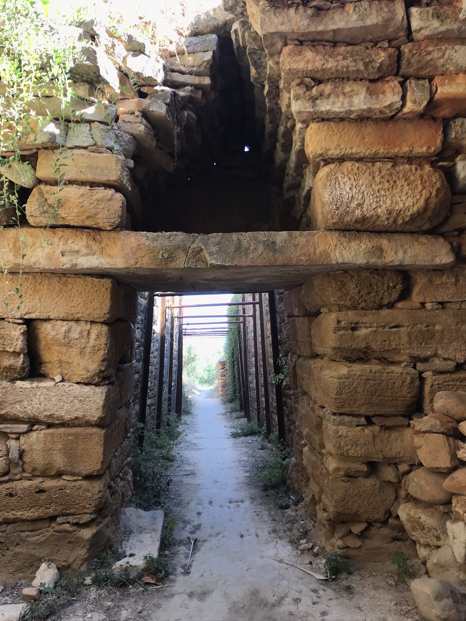På väg upp hade vi sett en skylt som visade vägen mot Minoan Tholos Tomb och när vi nu ändå gått hela vägen upp i värmen var det en liten kort avstickare på vägen ner. Det visade sig vara en lång stenbeklädd gång in till gravkammaren. Både gången och gravkammaren fick taket raserat under bombningarna. Men 1970 började man restaurera och ta bort all sten och jord som rasat in när graven bombades. Tyvärr finns inte mycket mer än så kvar då gravplundrare redan gjort sitt när graven ”upptäcktes”.