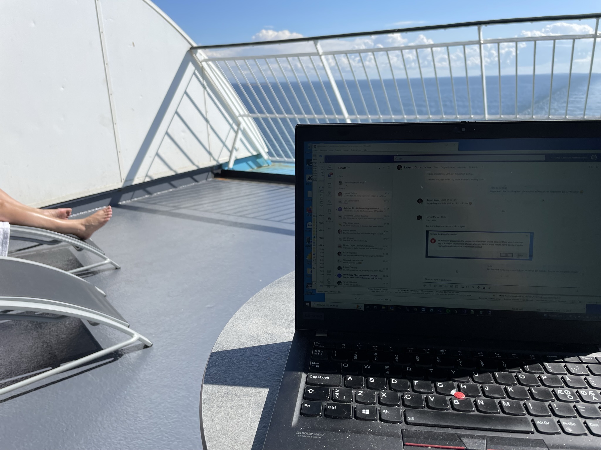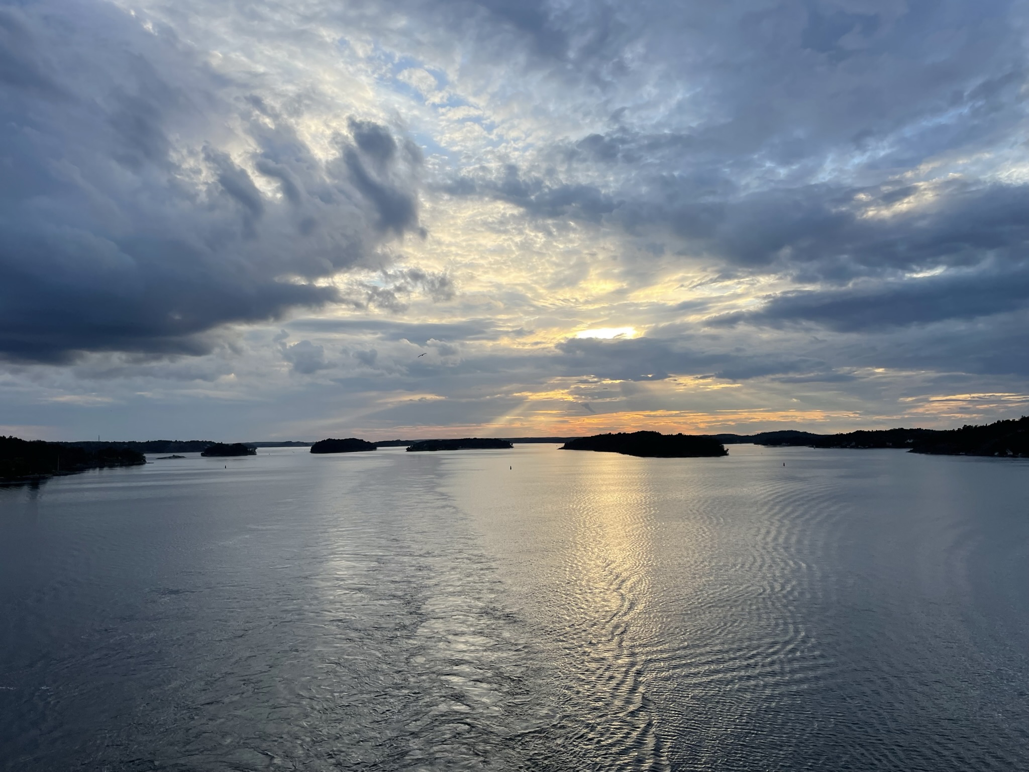 Morgonen efter blev det en lång god frukost med allt man kan begära och lite till. En del inköp gjordes i taxfreebutiken och sedan njöt vi på vi balkong i solen fram till lunch. Lasse jobbade i solen. Fortfarande ingen blåst och solen skiner från en klarblå himmel. Våra kamrater som tänkt åka med segelbåtar över Ålandshav till Mariehamn gav upp redan innan eftersom blåsten var för svår. Men av det märkte vi ingenting!