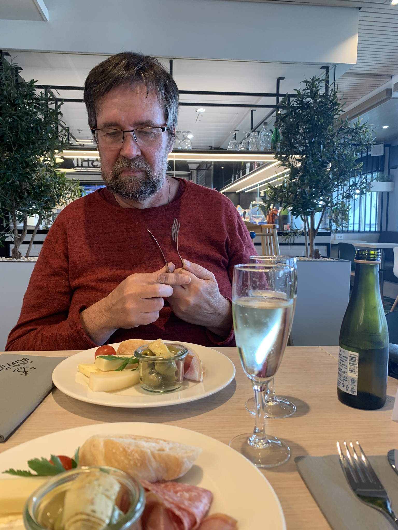 Den här gången valde vi en Executive Suite med balkong, precis som vi gjorde för några år sedan. Den resan kan du läsa om här. Denna gång hade vi fördelen att vädret var kanon, soligt och varmt och havet ”låg rakt”, som någon beskrev det i svärföräldrarnas loggbok för trålaren Modeste. Vi hade denna gång köpt till ett snabbspår som innebar att vi släpptes ombord först av alla i kön och blev lotsade till en av restaurangerna där det stod en tallrik med ost och charkuterier och varsin liten flaska bubbel framdukat. Det var toppen och kändes riktigt lyxigt!