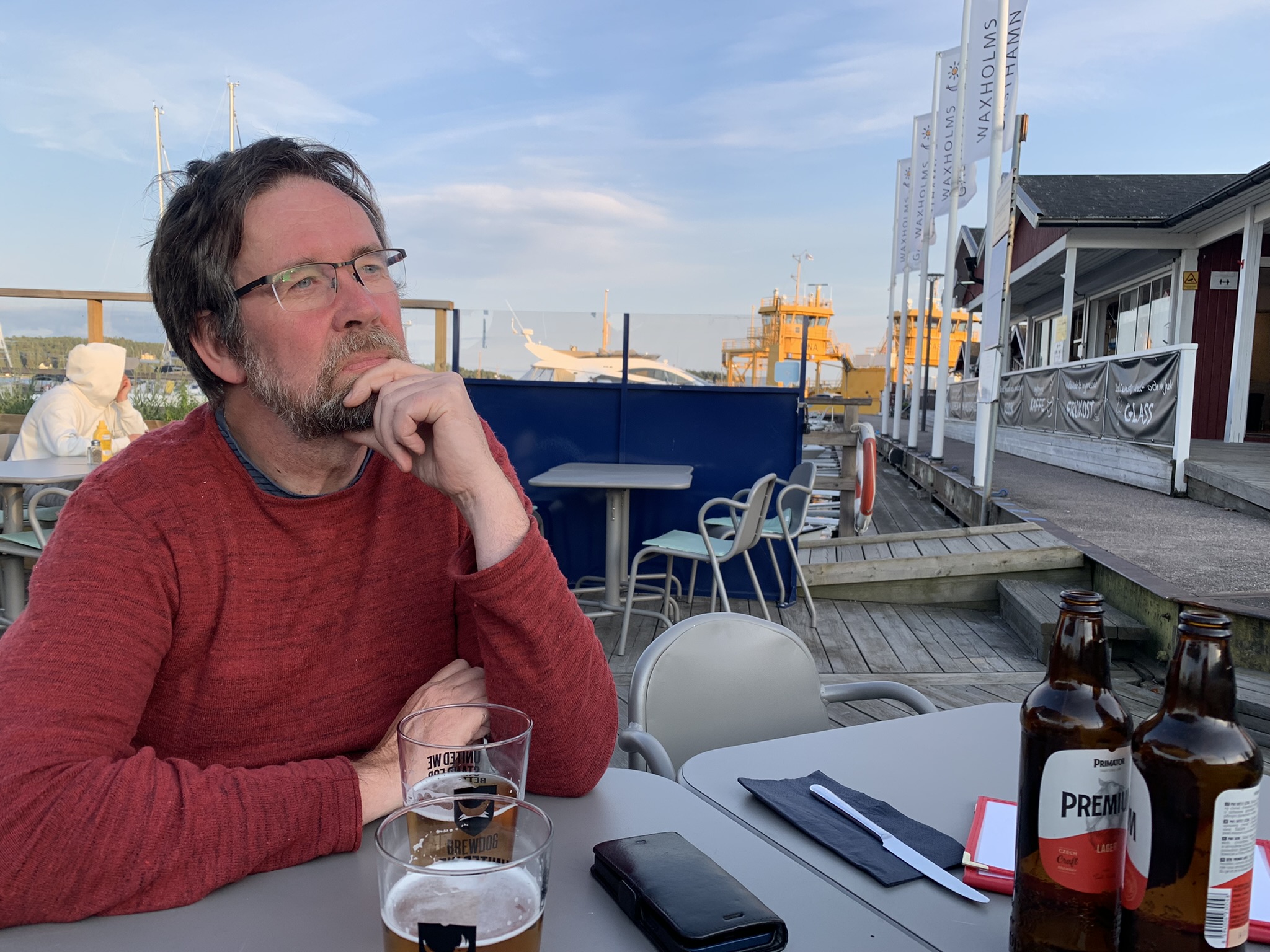 Väl i Vaxholm igen missade vi precis en färja med buss och fick glatt vänta en timme på Kobben vid Vaxholms gästhamn innan nästa buss gick på Rindösidan.