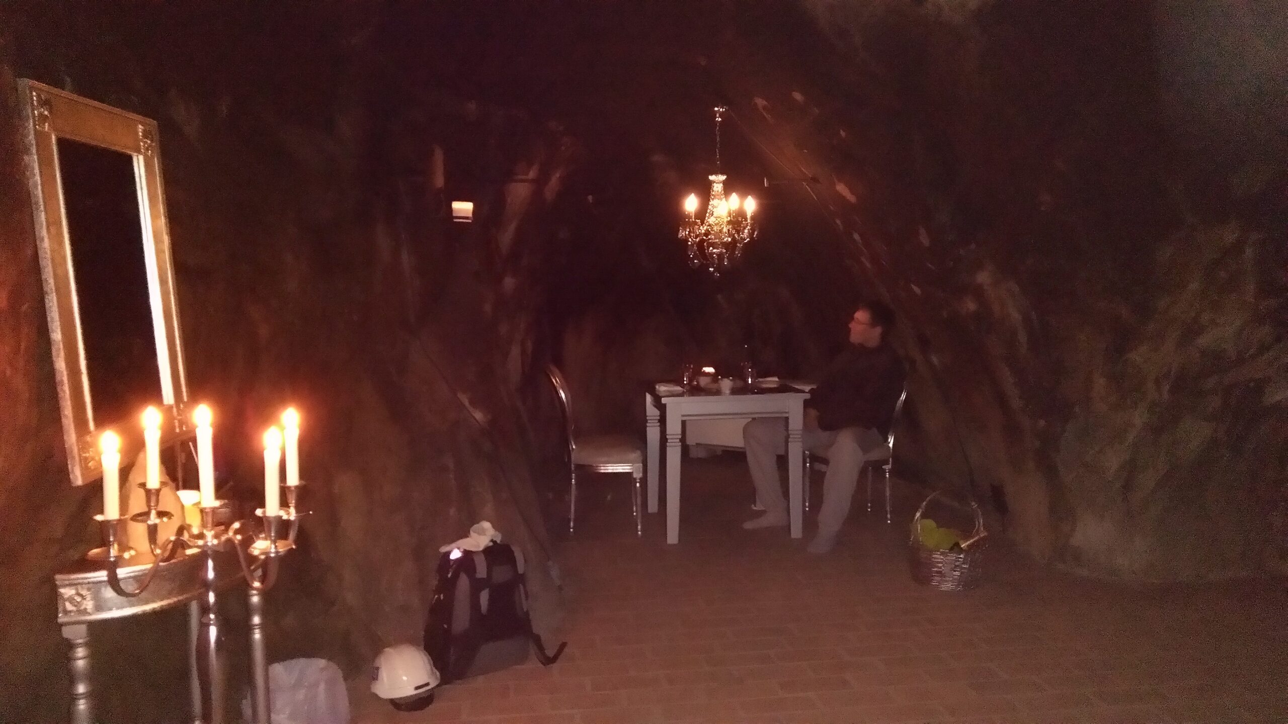 Det blev en riktigt mysig kväll i tystnaden under jord. Vi åt, pratade och hade det utmärkt. Samt såklart försökte förstå vad vi var med om. Visst kan man tänka att att det väl är som vilket boende som helst men de svarta, solida bergväggarna får en ändå på andra tankar.
