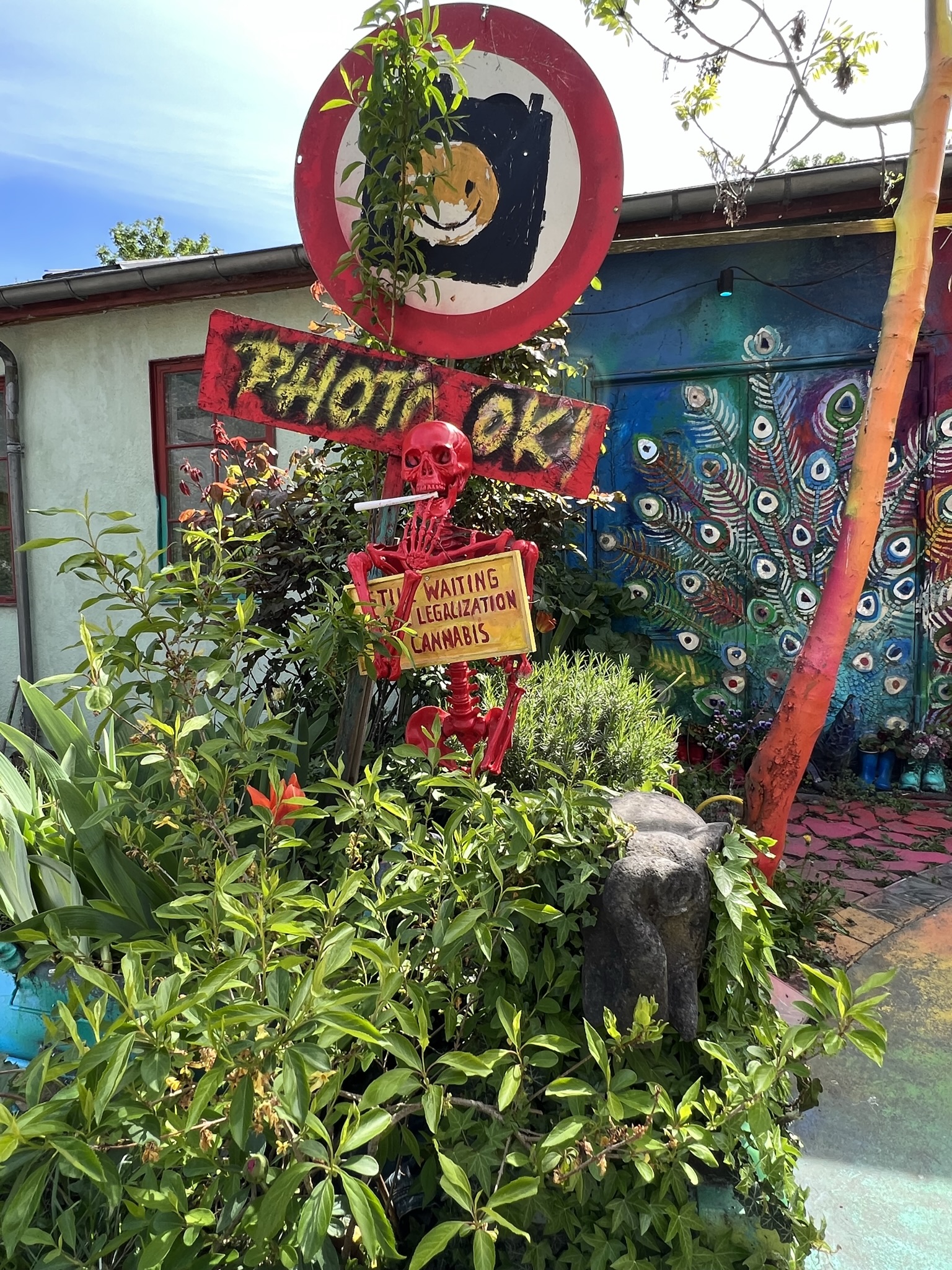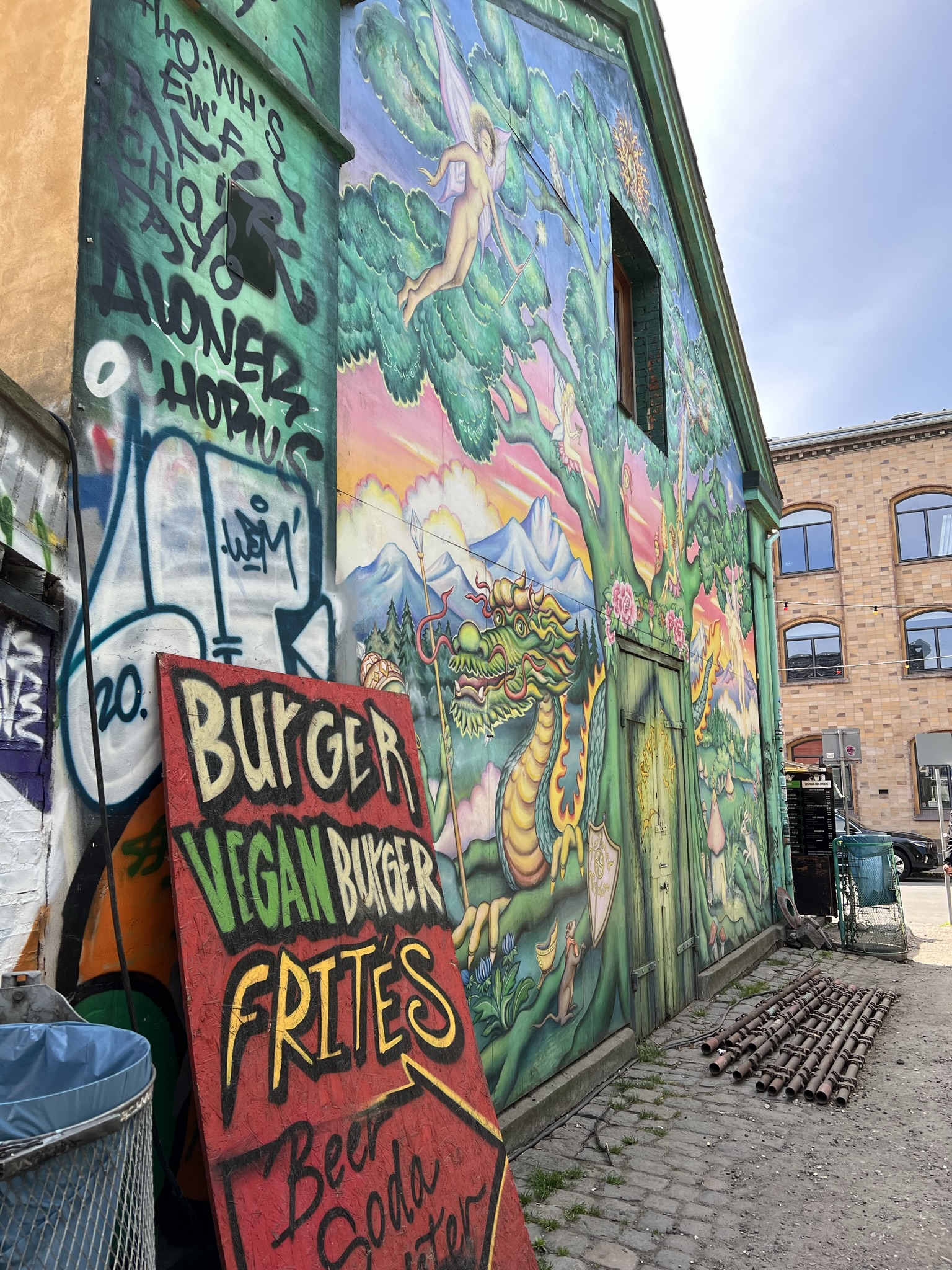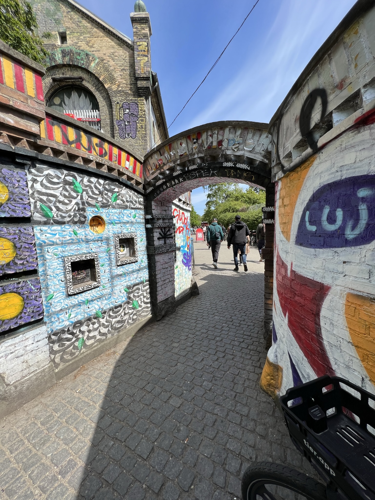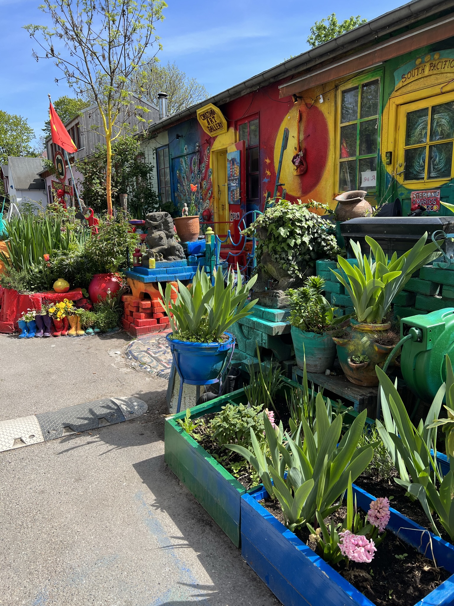 Vi bestämde oss för att gå strandpromenaden bort till Christiania som är huvudstadens fristad. Christiania bildades 1971 av ett gäng hippies som drömde om att skapa en värld i hippiekulturens anda. Många färgglada hus byggt av återvunnet material och flera stora väggmålningar. Även återvinningsstationerna var färgglada och det fanns hyllor där en kunde ta det någon annan slängt om en själv hade nytta av det.