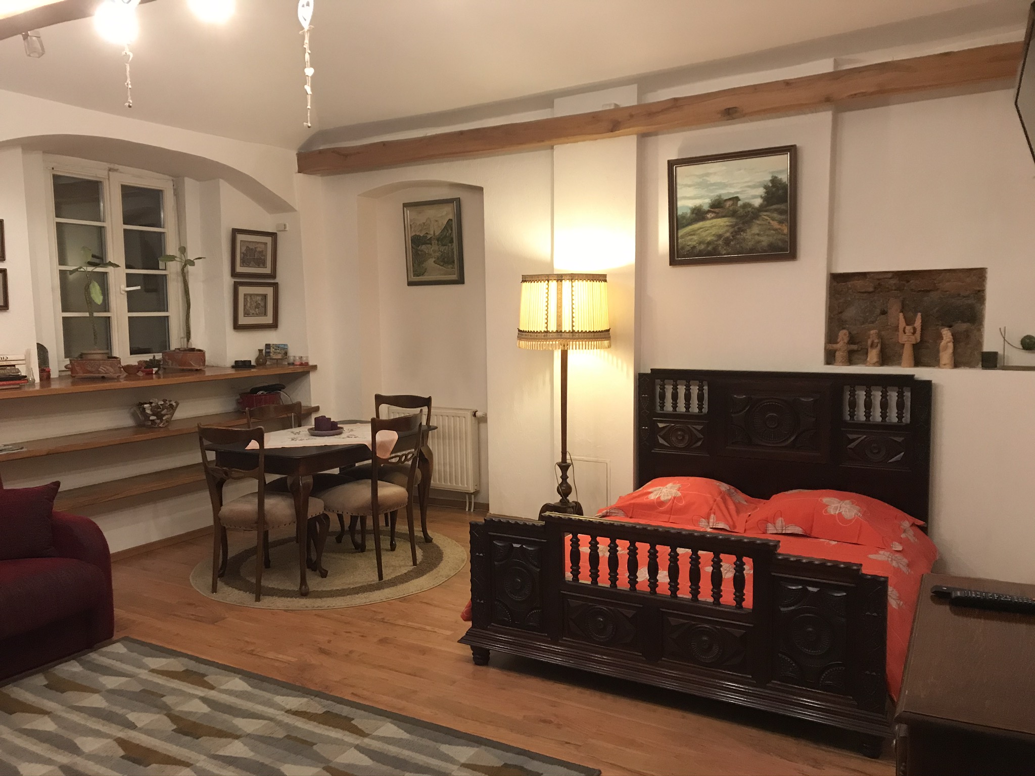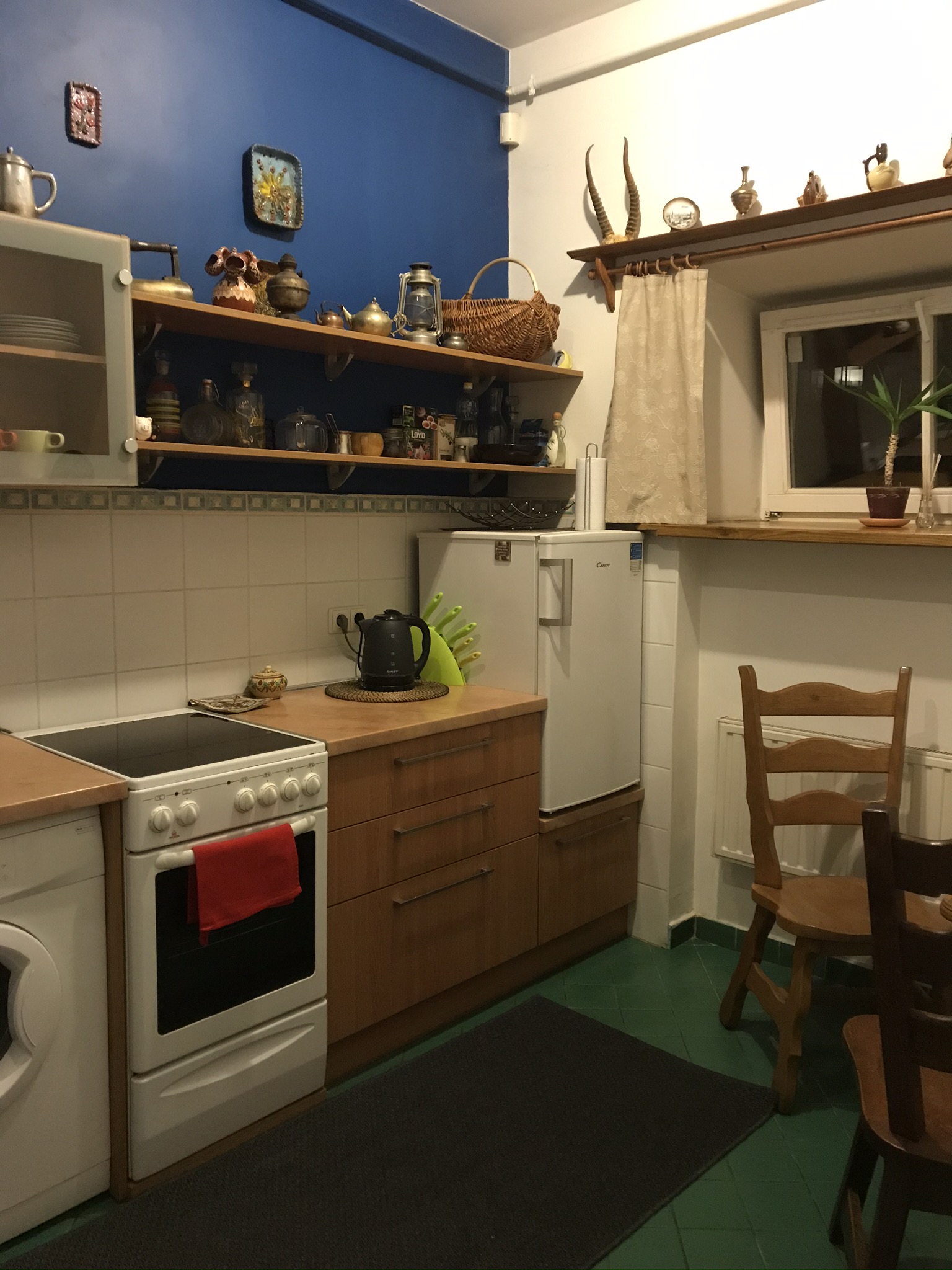 Vår hyresvärd Neringa kom med nycklar och visade oss till den lilla mysiga lägenhet som vi ska bo i de närmaste dagarna. Huset är 400 år gammalt. Tjocka stenväggar med stora fönstersmygar och rejält högt i tak. Köket är litet med mörkt klarblå väggar och grönt klinkergolv. Det här blir toppen!