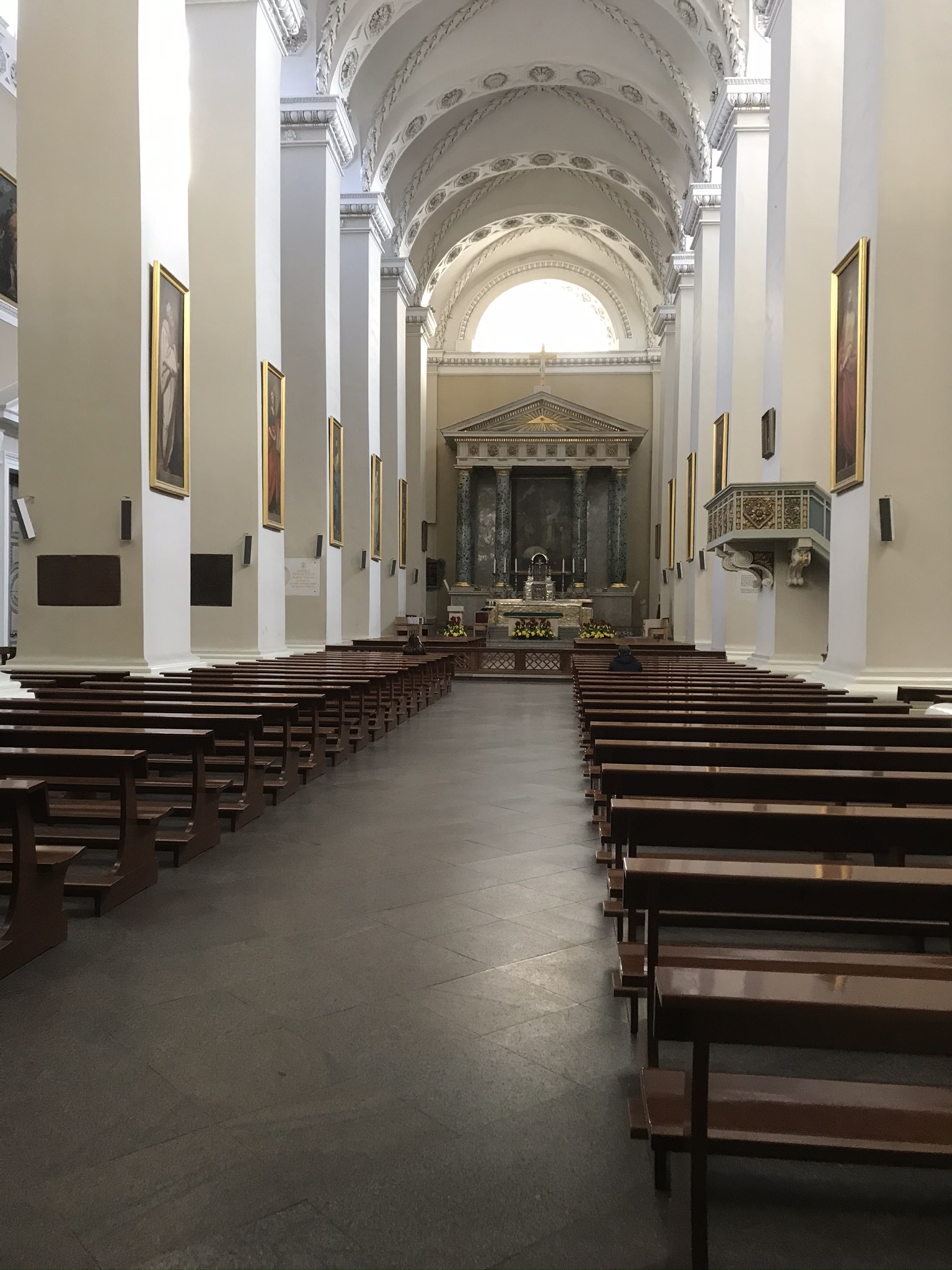 Gick till sängs ganska tidigt igår så vaknade också tidigt, till den ljuva låten från marskatterna utanför. Vi hade tänkt börja dagen med en rundtur på stan via Vilnius with locals. Tyvärr dök dock ingen guide upp så vi bestämde oss för en egen rundtur via en app, PocketGuide. Men eftersom vi redan var vid den stora katedralen (Arkikatedra Bazilika) så var det lika bra att förära den med ett besök. Fantastiskt innandöme med stora tavlor och imponerande takhöjd. Olikt våra kyrkor där hemma!