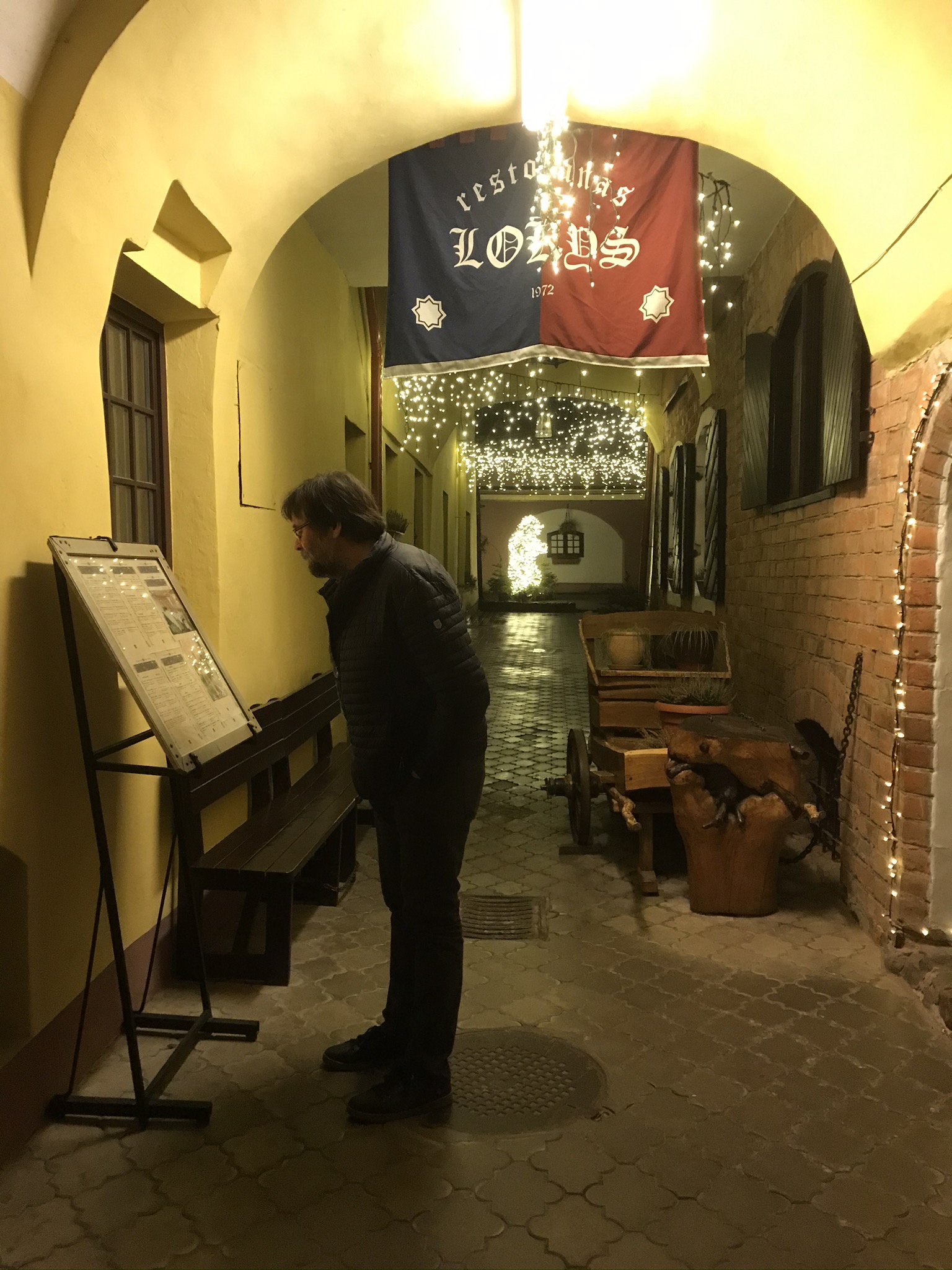 Hittade en resturang, Lykos, som hade vilt som specialitet. Lasse åt vildsvin och själv tog jag rådjur. Väldigt gott var det och bra service vilket vi förstått inte hör till vanligheterna här i Litauen. Passade även på att äta efterrätt med tillhörande vin, hasselnöts kaka och vaniljglass (alltid gott) med vinkokta körsbär. Goda efterrätter som passade finfint till vinet. Till notan serverades en liten hutt med nåt örtsprit, smakade lite som Jägermeister men mycket snällare.