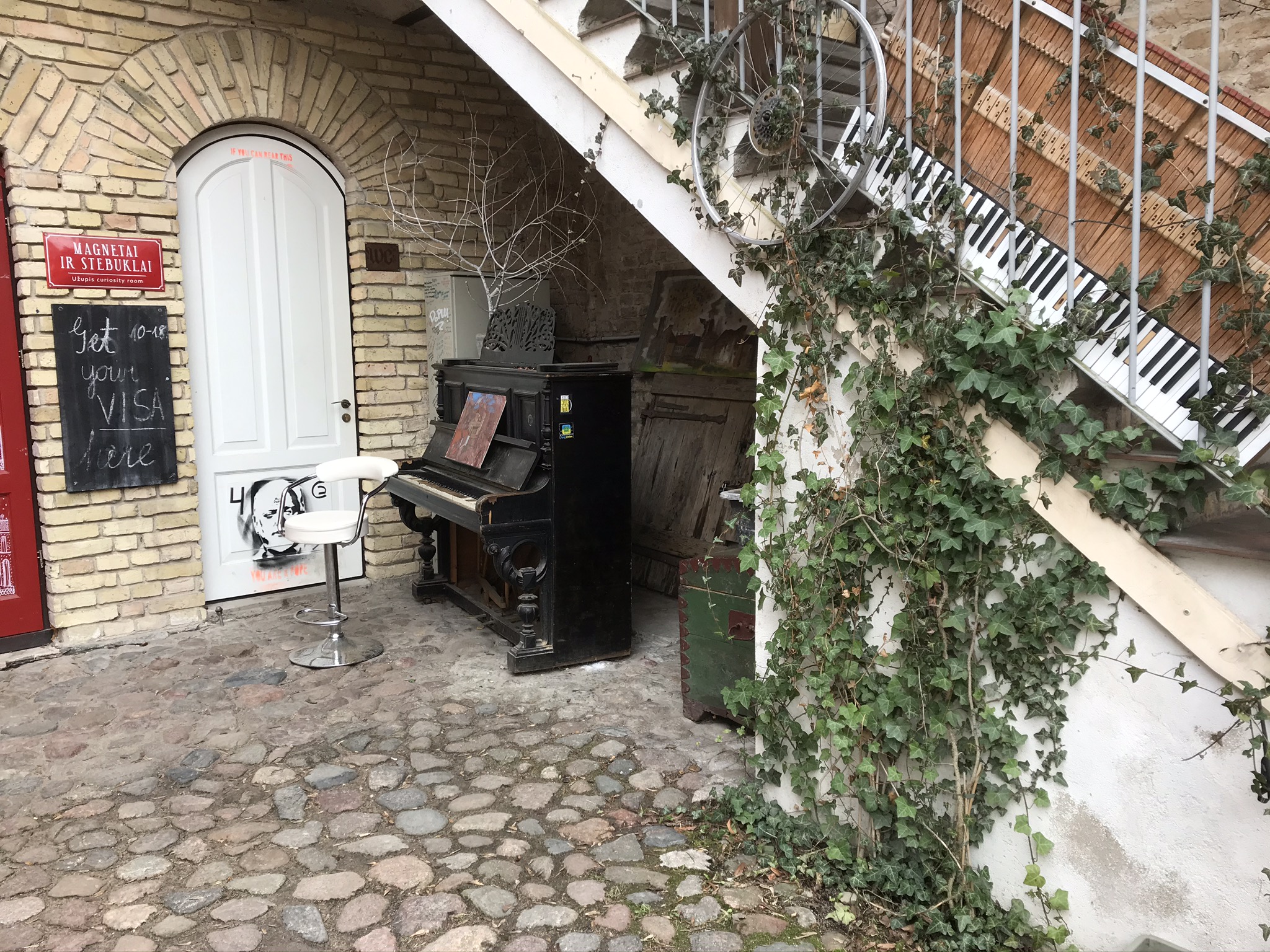 Idag är det dags för att fortsätta vår app-gudning vi aldrig avslutade igår. Gick ner till den gotiska tegelkyrkan igen och fortsatte vår vandring förbi universitetet, flera kyrkor och drakens boning för att slutligen hamna i det hippa Usupis. Ett ställe att jämföra med vårt Södermalm, dyrt och hippt. Tog några cacher på vägen också.