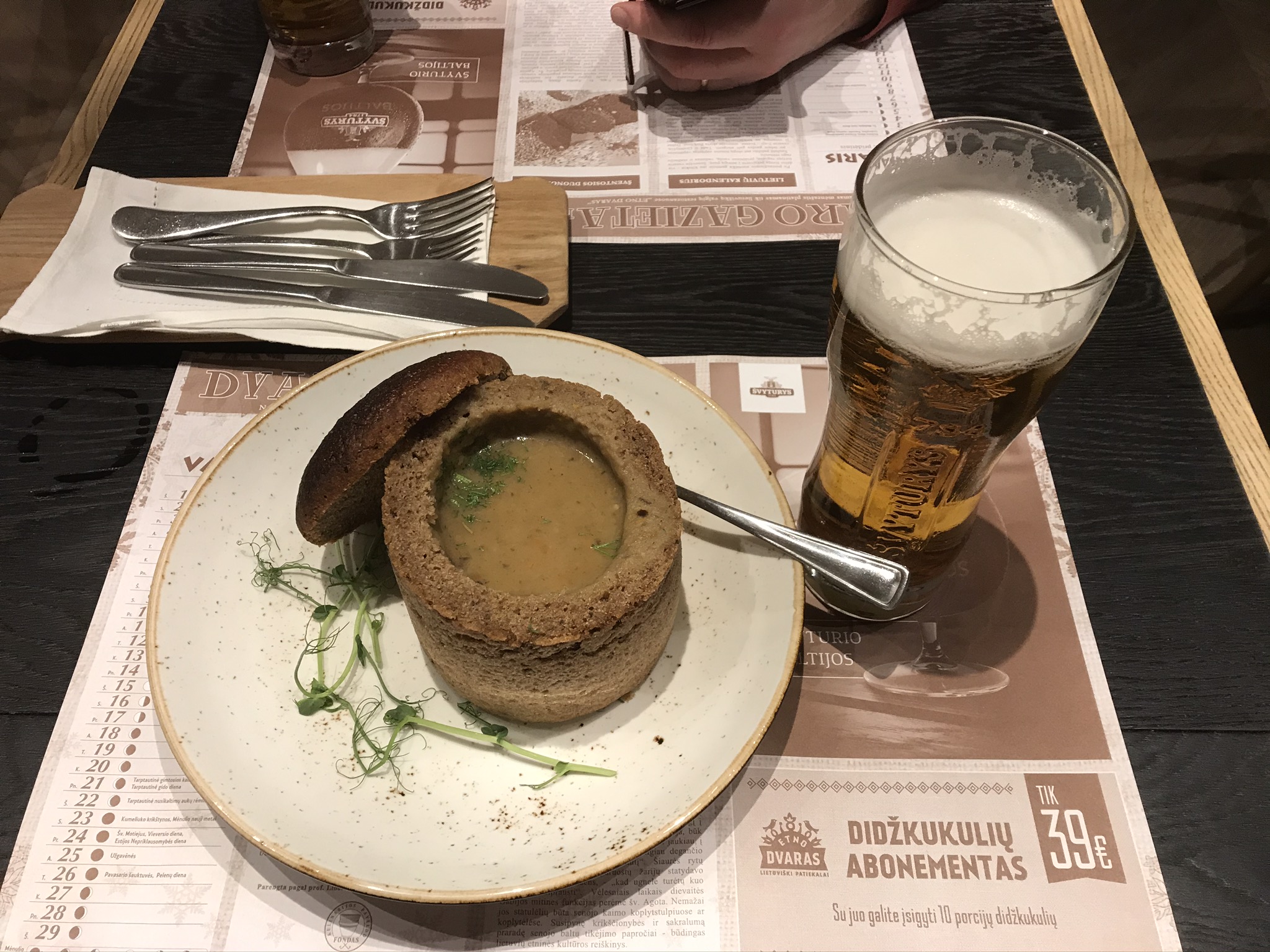 Till middag ville vi testa litauisk mat och gick därför till Dvoras. Jag åt svamsoppa serverad i mörkt bröd och potatisplättar med köttfärs i som serverades med smetana. Lasse gick på kött och tog en entrecote. Gott!