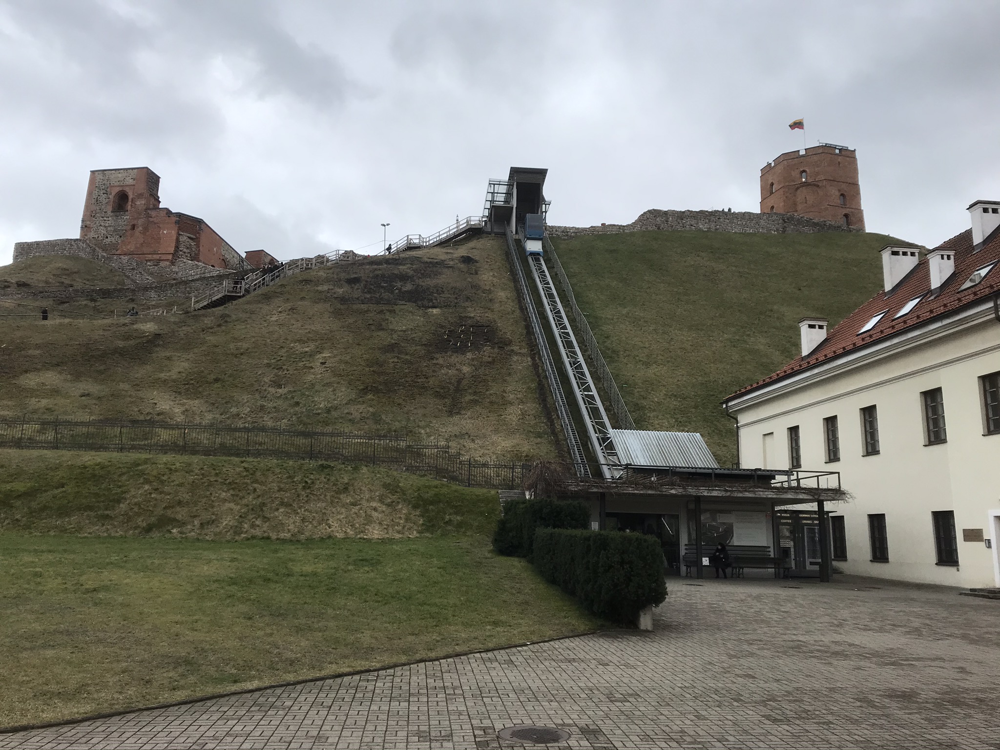 Frukost och melodikryss. Sista dagen. KGB museum eller Gediminas slottstorn? Hmmm, vi tog tornet. Eftersom det i alla recensioner stod att bergbanan upp i stort sett alltid är trasig så gick vi i många trappor och kullerstenbackar innan vi nådde upp till tornet. När vi väl kom upp såg vi att bergbanan visst var igång. Nåja, vi har väl valt den svårare vägen till mål förr.