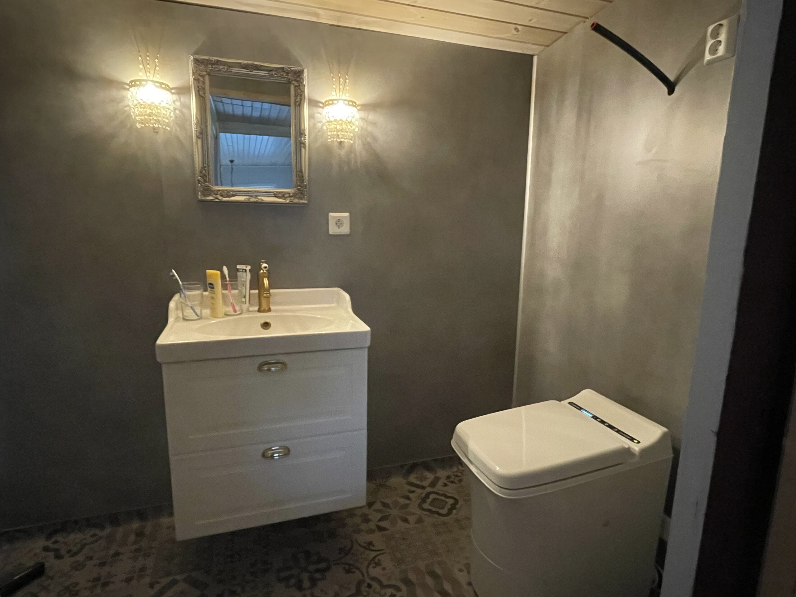 Därefter var det dags att få resten av FiboTresbo-skivorna på plats i det renoverade badrummet. Vi hade satt upp nästan hälften förra gången vi var ute men de två väggar som återstod hade alla hål i sig, för vattenledningar och elkontakter och sånt. I verkligheten var det därför långt i från hälften som var klart. Det tog oss hela helgen att få upp resten men hellre ta det lugnt än att såga fel var den devis vi följde. Vi hade inga extra skivor så det var rätt skönt när den sista listen kunde tryckas dit utan en enda felsågning. Skönt!